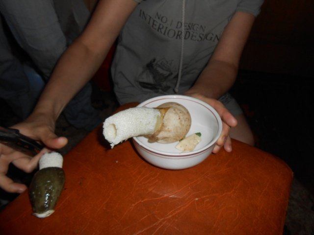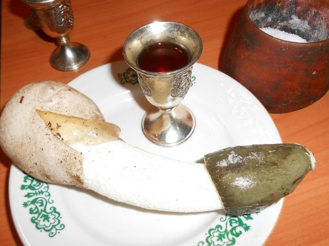 Все с Большим удовольствием "попробовали" деликатес, Очень понравился... "Где купили?", "Из чего сделали?" "Сами делали или в СушиБаре заказывали?" сравнивали вкус с редькой, редиской, репой... Вобщем остались Довольны и расспрашивали где ещё такое можно Достать :-)... и после такой вот Презентации деликатеса Я внёс тот самый спрятанный гриб и .. "ТАДЫМ! ФАНФАРЫ!!!" вот Он тот самый Деликатес ВО ВСЕЙ КРАСЕ! Только что с таким ПРЕВЕЛИКИМ УДОВОЛЬСТВИЕМ совместно съеденный за этим столом, Вот Он этот Красавец!!! Точно такого же мы разделали на красивые дольки и теперь Он Внутри Каждого из Вас!!!