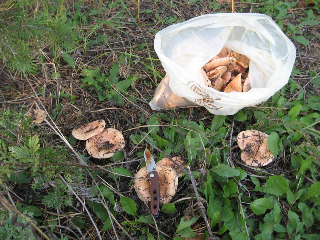 Рыжики толпами! Огромные рыжики толкаются, тесня друг дружку, под маленькими сосенками - и ЭТИМ зарос весь склон! Облазив кусочек метров 50 в поперечнике мы набрали 3 огромных 60-литровых пакета, но так как солнце уже садилось, вынуждены были оставить грибы несобранными. Так же как  на прошлой неделе про волнушки - там можно собирать бочками.