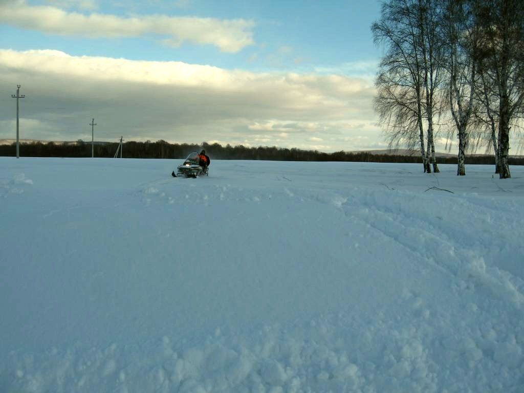 Доехали до Фроловки, увидели следы, уходившие по направлению к Атышу. Остановились. И вовремя: к нам приблежались два парня на снегоходе.