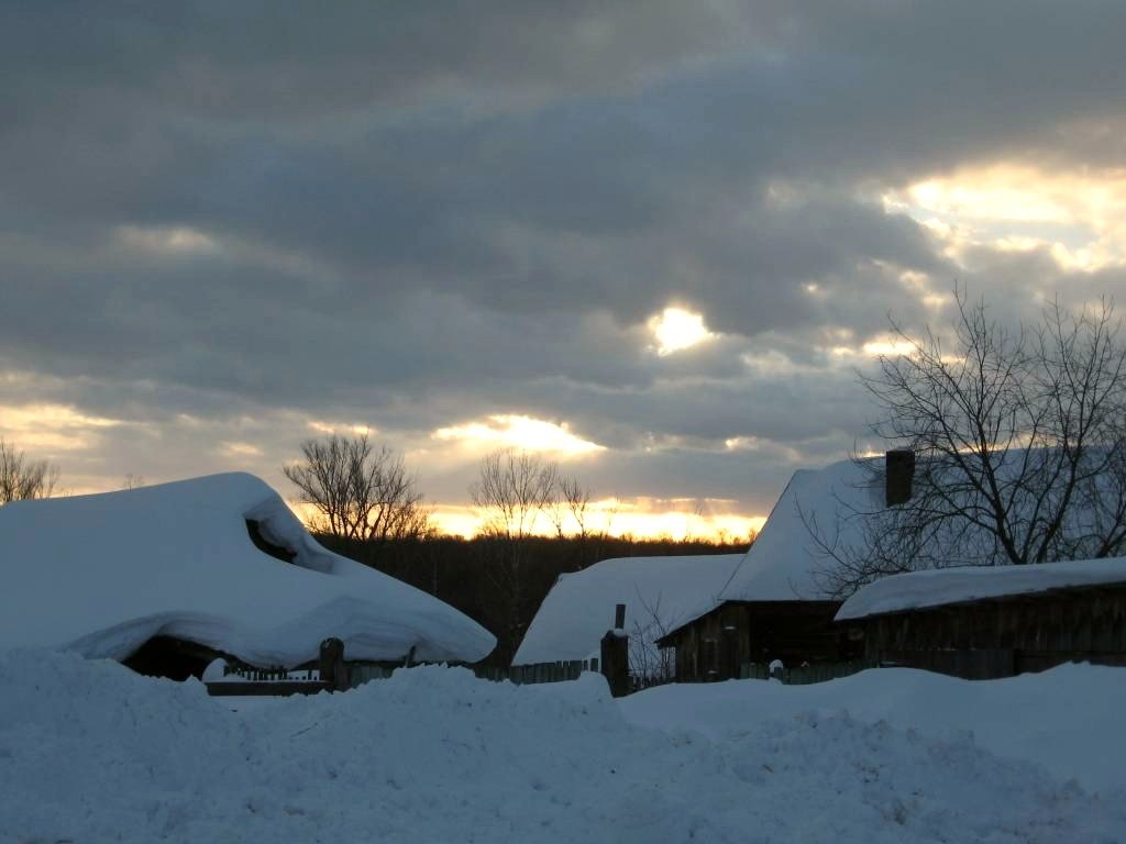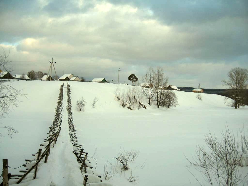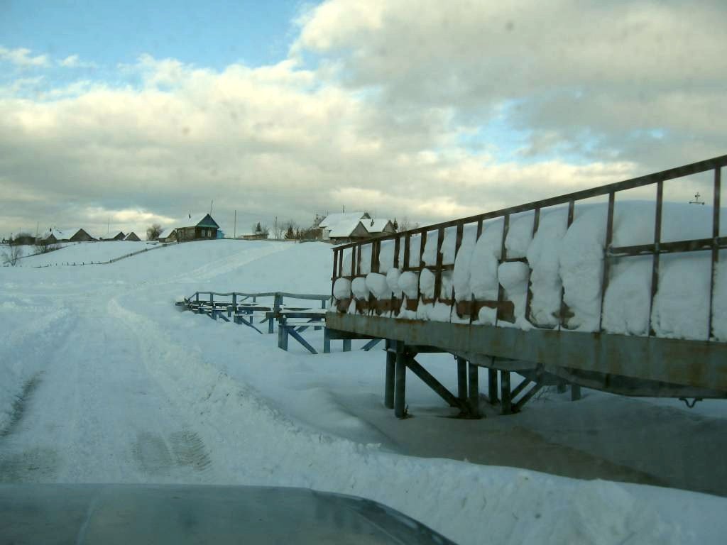 По мосту было идти страшновато - состояние его оказалось аховым: правые перила разрушены, некоторые доски проломлены, так что след обрывается немного не доходя до другого берега... Обернулась... а возвращаться, оказывается, еще страшнее! Решила топать по целине. Ага! Шаг - и я по пояс в снегу! Чуть валенки до весны там не оставила. Ну где наша не проподала, "поплыла" по снегу до ограждения и по нему уже шаг за шагом начала перемещаться в сторону дороги. Так дошла до края горки и на попе поползла вниз к дороге. А муж тем временем искал тропы к Атышу, обходя всю деревню, и даже в ближайший лес завернул. Но пока я выбиралась и добиралась до машинки еле переводя дыхание, он уже меня ждал.