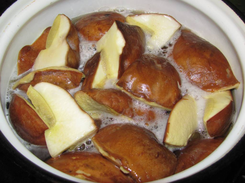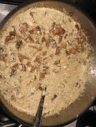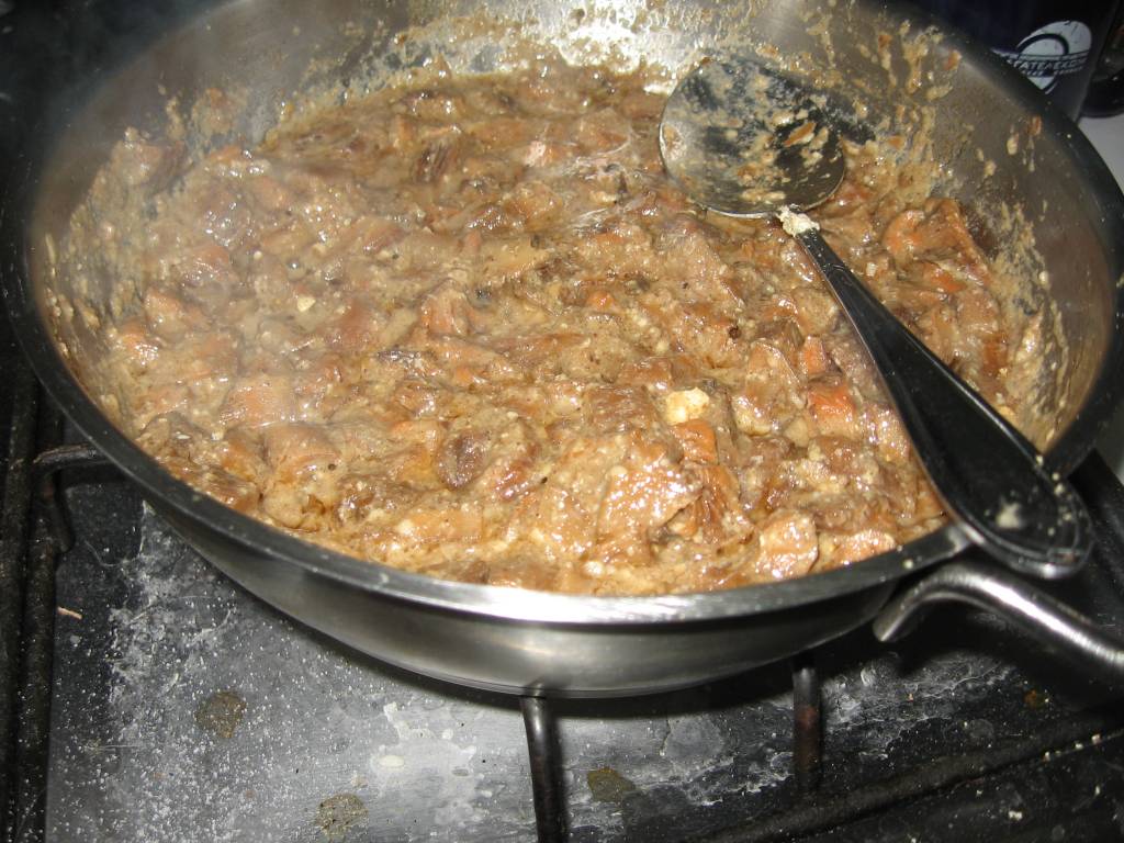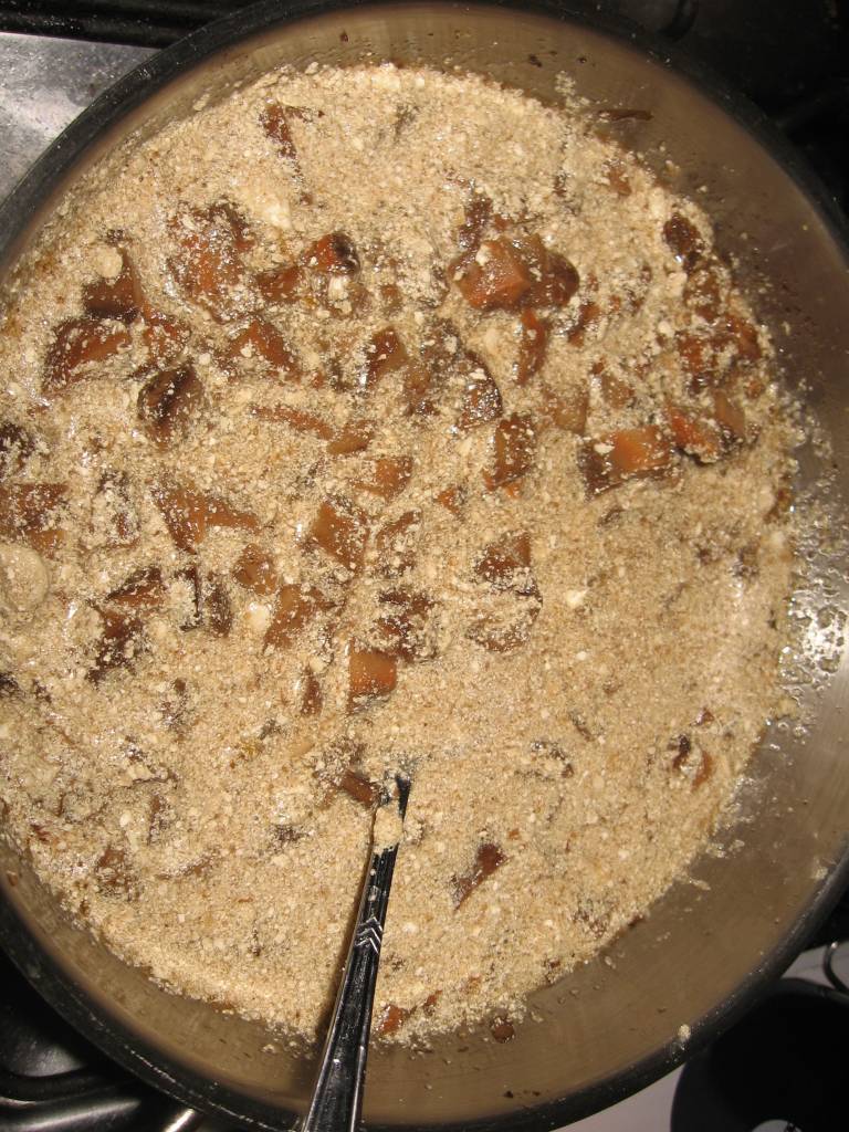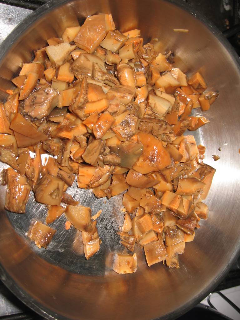 Пришлось, чтоб не выкидывать маринованные рыжики, их попытаться исправить как-нибудь. Решили пережарить, для этого маринованные грибы были залиты водой и тщательно выпарены от уксуса. После этого было добавлены молотые сушеные рыжики и сушеные дождевики (в память о...), чтобы скрыть отсутствие вкуса килограмма маринованных - парой ложек сушеных грибов.