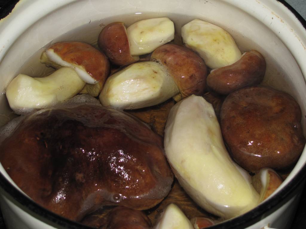 Сам способ маринования. Грибы обработать: помыть, и убрать поеденности червями. Отварить минут пять в слегка подсоленой воде, откинуть на сито и разложить по банкам. Залить водой, в которой они отваривались, и добавить на 1 литровую банку 1 ст.ложку уксуса и 1 ч.л. соли. Крышки слегка наживить и поставить банки в кастрюлю с водой, довести воду до кипения и минут 20 стерилизовать, затем слегка бултыхнуть, чтобы вышел воздух, затянуть крышку и поставить в перевернутом виде на полотенце томиться. Кучу готовых банок сверху также накрыть полотенцем.