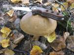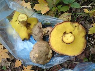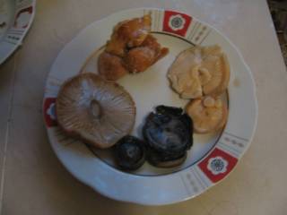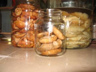 Желтые грузди. Количество их в этот раз было небольшое, так как нашли их не на груздочном месте а на полянке, так что уместились они в маленькую баночку - самое то на попроб. Тоже попробовали через две недели засолки. Вкусные соленые грузди, слегка с горчинкой оказались, относительно них оценивали остальные грибы.