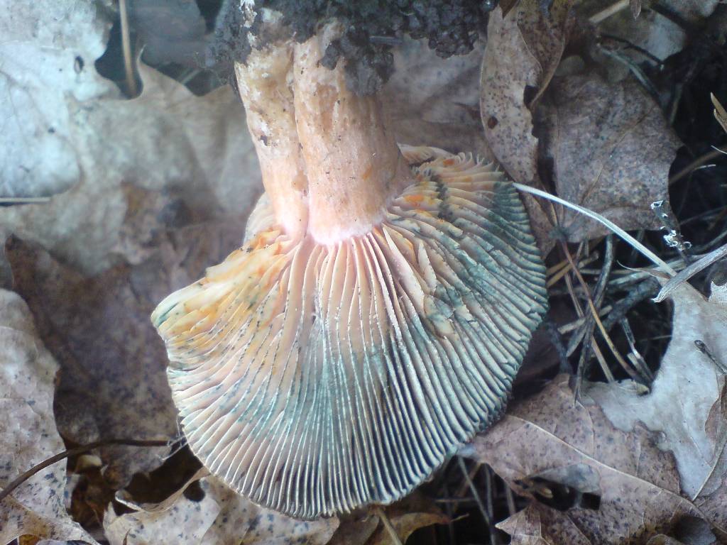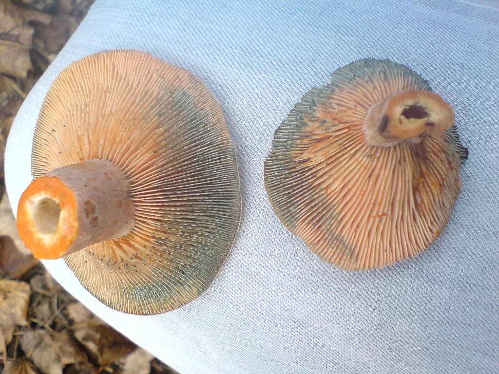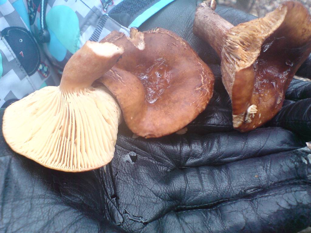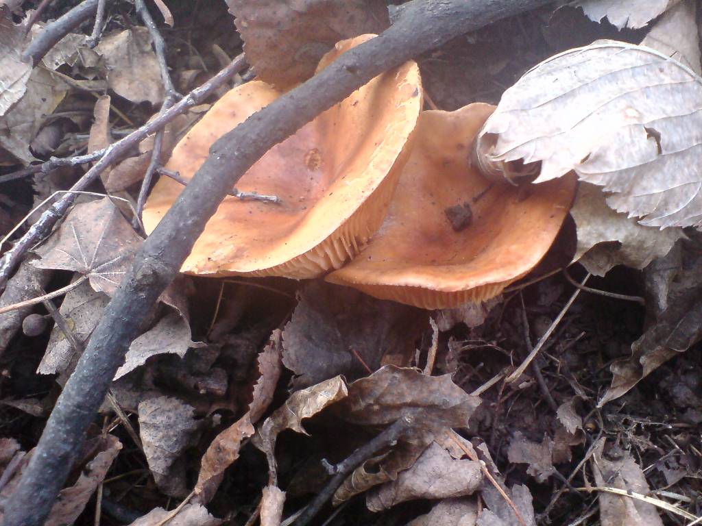 Как вдруг, заметили в сухой листве, торчат красненькие шляпки грибочков. Сковыряли -ба! молоденькие красные грузди. Забавно, не думали, что они еще в это время бывают.