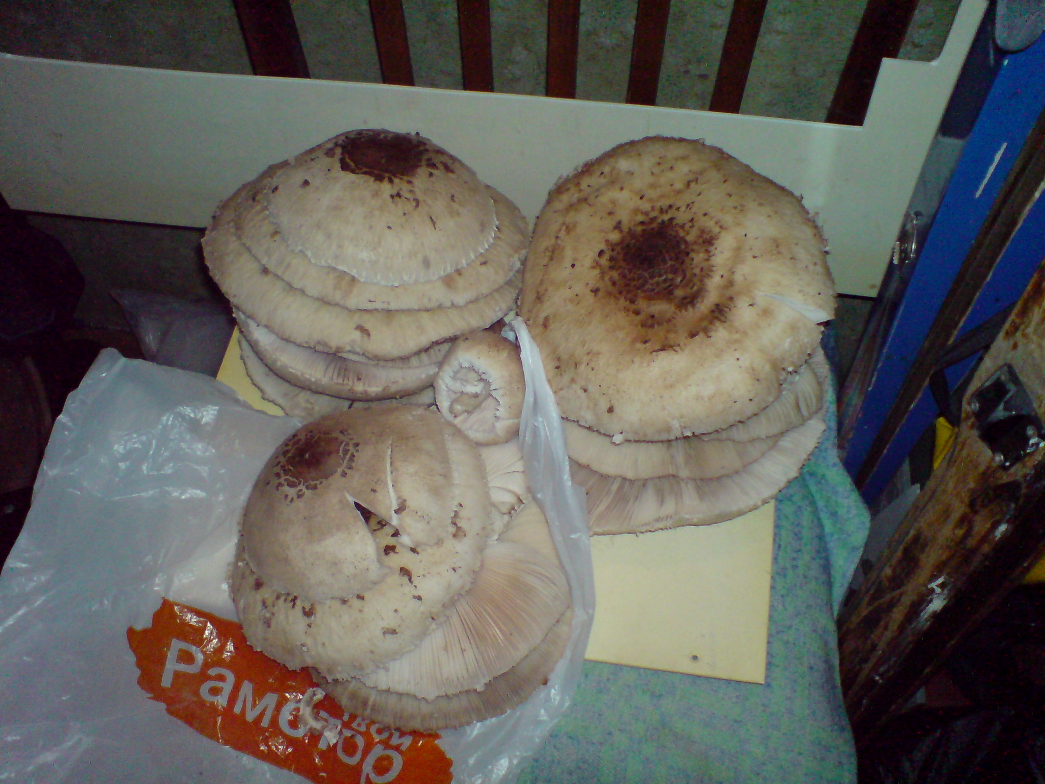 Это шляпки зонтиков - грибы очень вкусные, особенно вкусны они в качестве блинов, так же можно просто пожарить и в дальнейшем использовать как начинку для пирожков. А можно заморозить шляпки и зимой сделать из свежих грибочков блинчики. Так же мы их сушили - их ореховый вкус блюдам придает пикантный аромат.