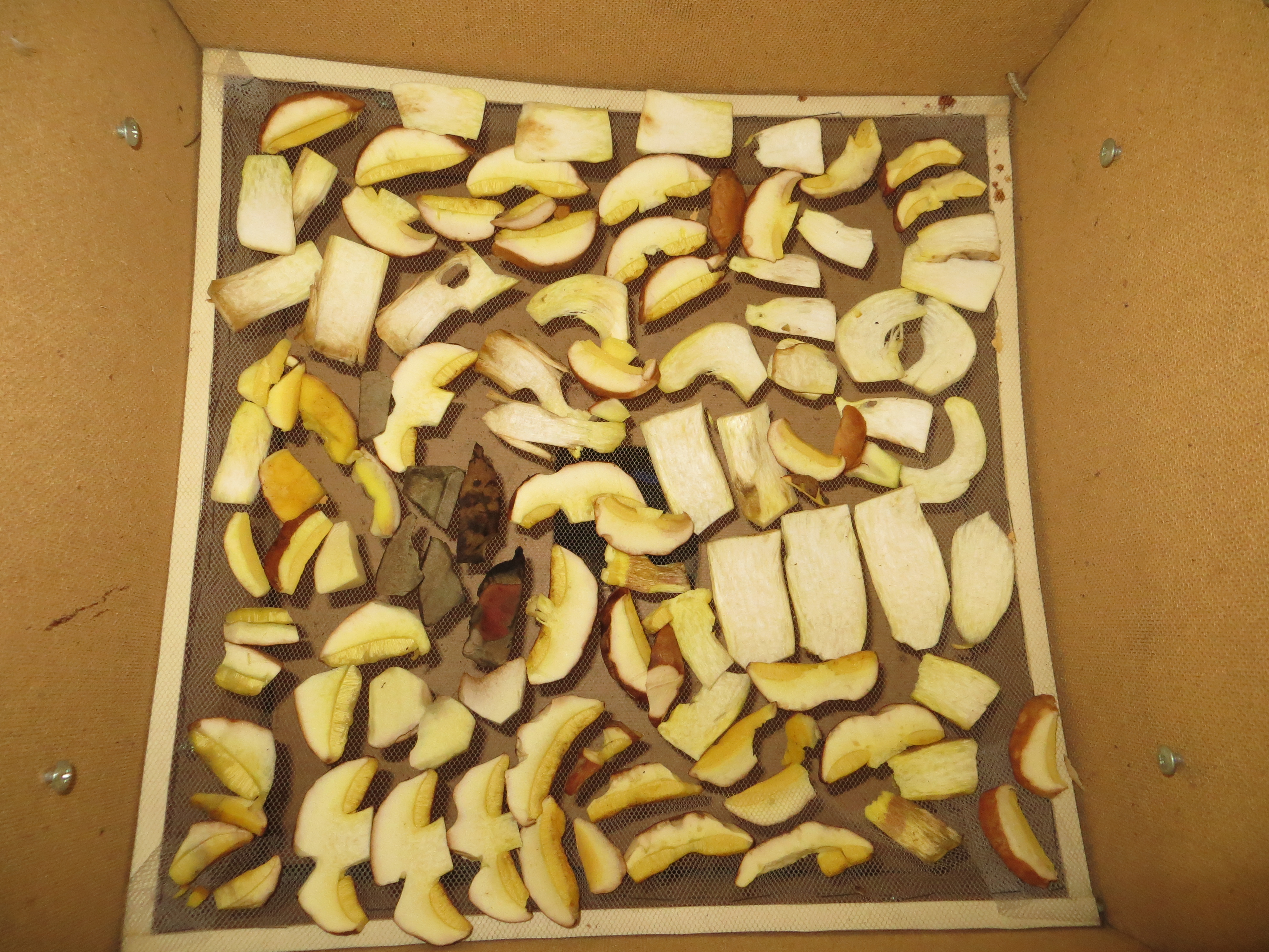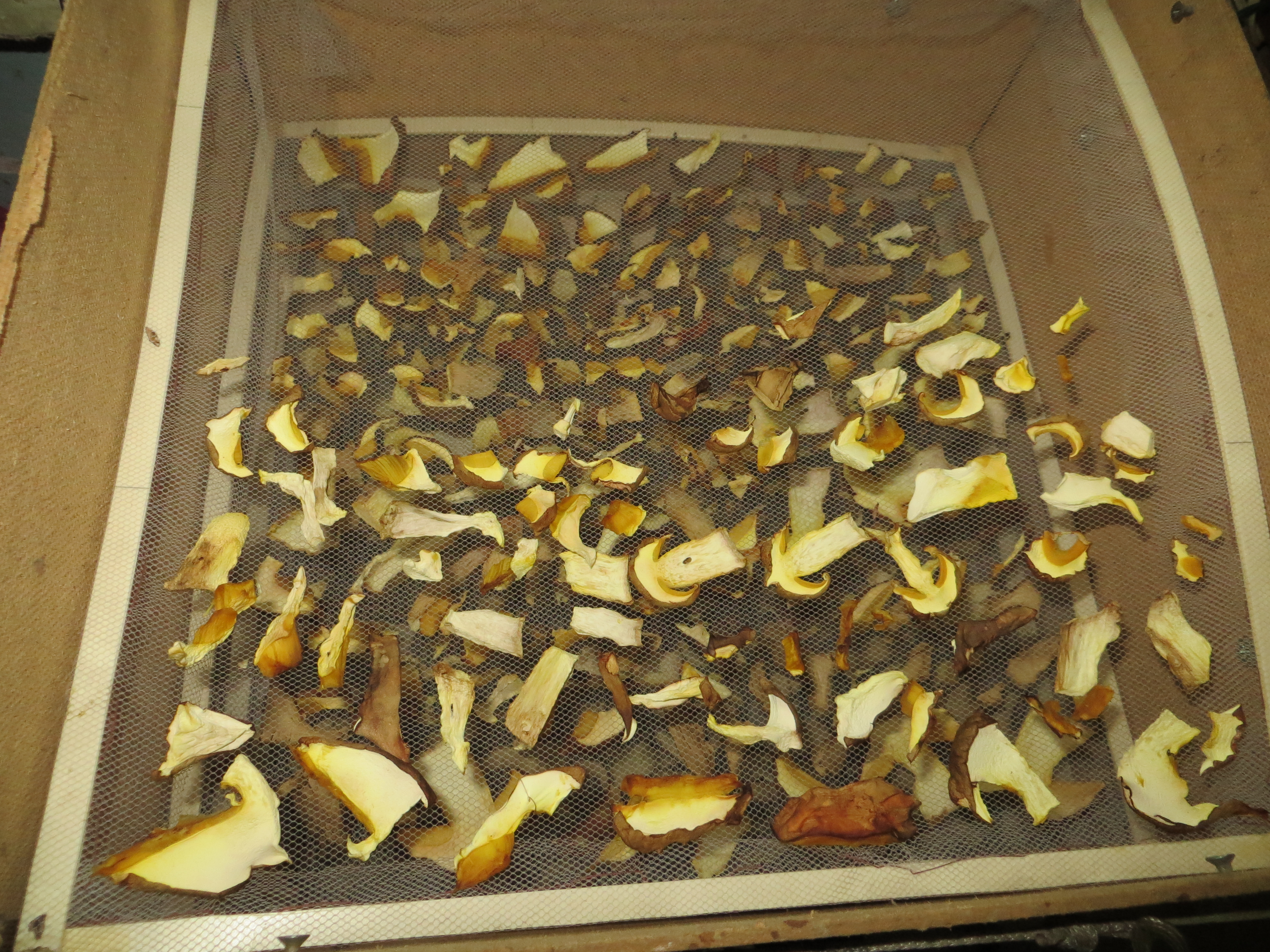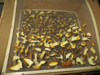 Вот и у нас сделана специальная сушилка для грибов, которой пользуемся уже много лет. Представляет она из себя короб из ДВП, в котором сделаны кронштейны для крепления нескольких сетчатых "полок", на которые выкладываются нарезанные ломтиками грибы, а также дна и крышки. Крышка - самая главная часть сушилки! В ней расположены 4 80мм вентилятора, обеспечивающих постоянный поток воздуха. Поэтому вокруг грибов не образуется застойной зоны повышенной влажности, и даже дождливой осенью производительность сушилки такая, что грибы высыхают за три дня.