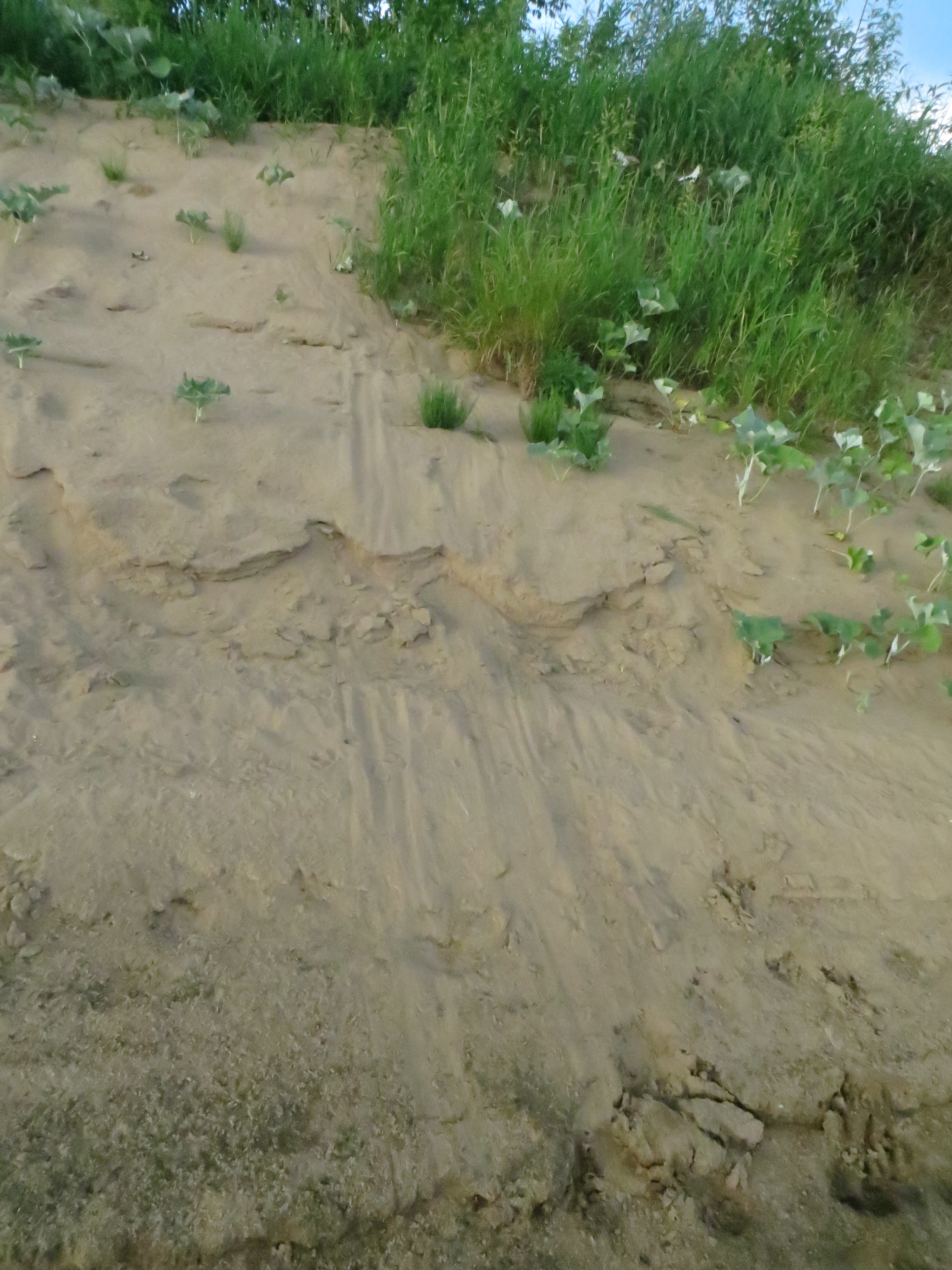 Отдыхали на Симе. Видели следы бобров. Уж не знаем, где у них хатки на реке, но было интересно их следы наблюдать: они залезали вверх на песчаный берег, грызли молодую растительность и скатывались с добычей по песочку вниз в речку.