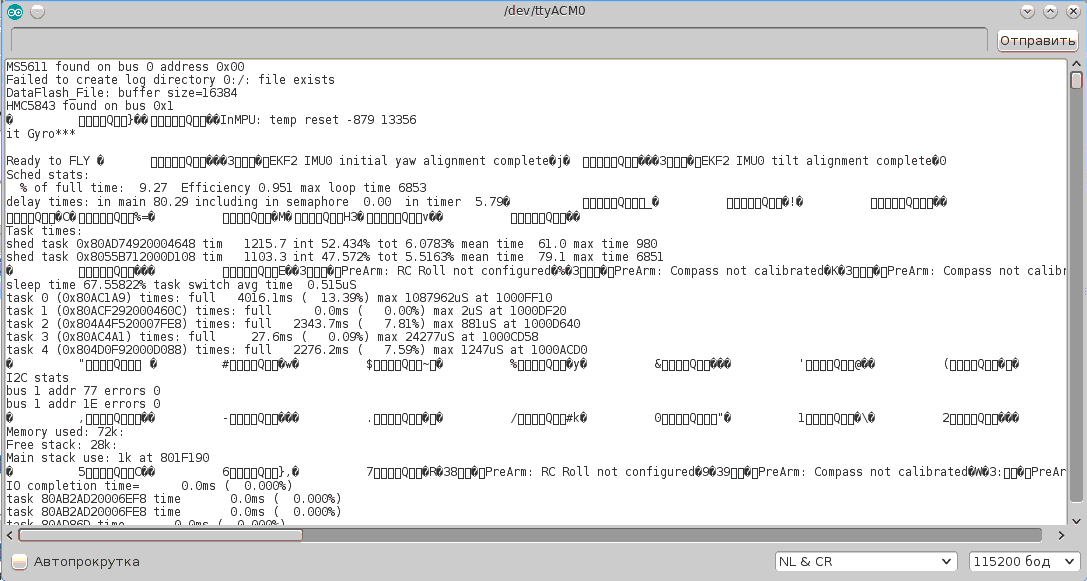 вот так выглядит консоль. "мусор" между символами это сообщения Мавлинка HEARTBEAT раз в секунду