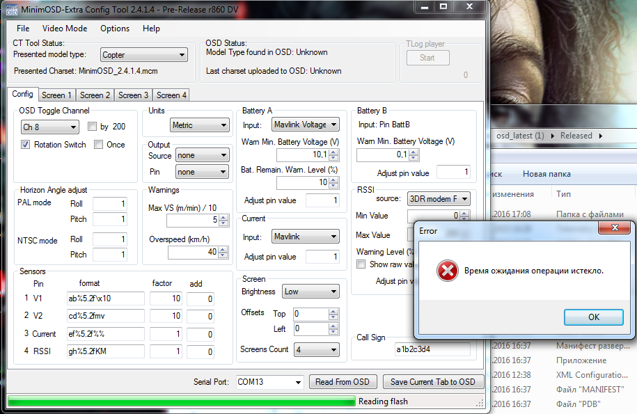 Странное дело: сейчас поробовал ещё раз прошить с кнопкой reset- вроде бы и прошивка и шрифты загрузились,только при подключении монитора на пару секунд высвечивает текст с версией обновлённой прошивки и далее опять пустой серый бегущий кадр. Просто непонятно где именно я туплю и в какую сторону рыть дальше...