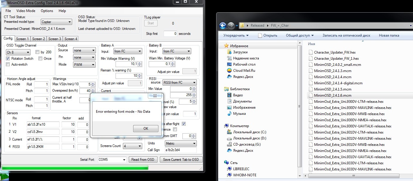 В архиве по вашей ссылке версии прошивок уже 9xx. Я выбрал 946_mavlink, мне подключаться к АРМ. Прошивка влетела, в конце выдало сообщение о потере связи с бутлоадером, ну это из за отсутствия DTR. Пытаюсь залить шрифты, ошибка (прикреплен файл).
