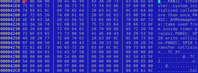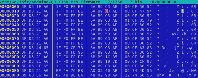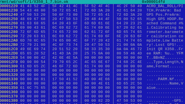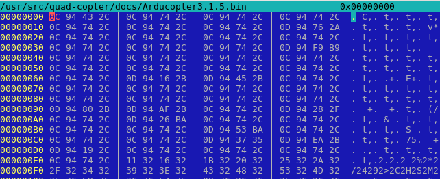 XOR-им прошивку по этому ключу и смотрим что у нас получилось. Но перед этим внимательно просматриваем Ардукоптер и изучаем что должно получиться: видны заметные массивы читаемого текста и нулей.