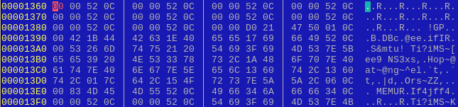 Не правда ли, похоже на текст - нет старшего бита и буквы те самые. А что это за регулярный паттерн - 00 00 52 0с ? Это случаем не нули между текстом?