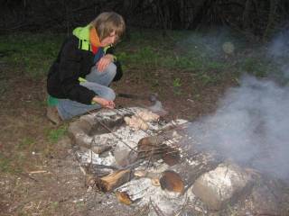 Кстати, о печеной картошке. В угли можно закинуть картошку (предварительно ее помыв), прикопать углями, и через час готово.  А кушать так - готовую картошку порезать пополам, посолить, и ложкой (или ножом), мякоть ковырять.