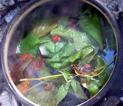 Кипятим воду в котелке, снимаем с огня и бросаем наши травы в крутой кипяток. Накрываем и настаиваем 10-15 минут.