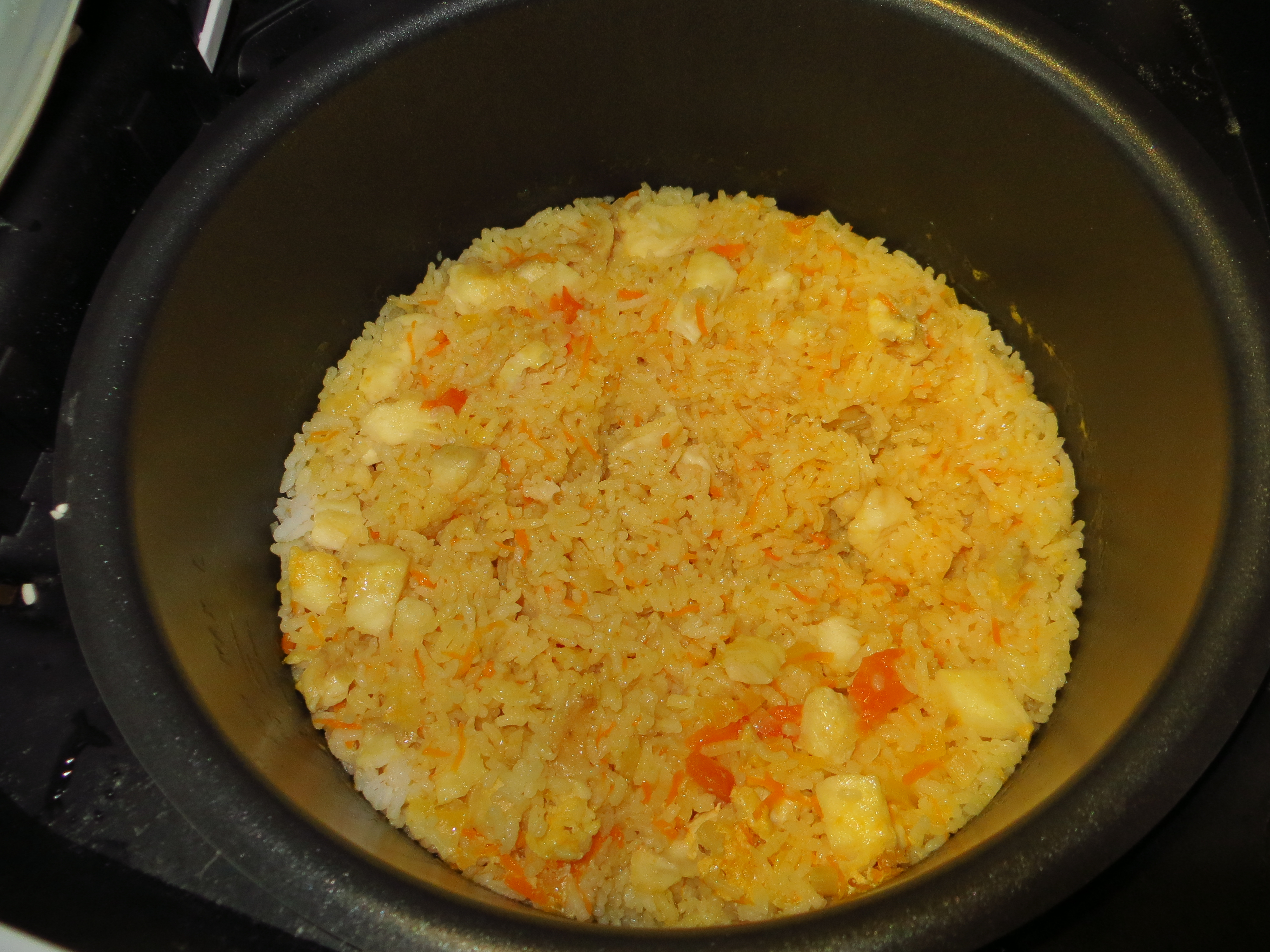 На дно чаши положили лук кольцами, тертую морковь, немного воды. На морковь куски мяса кролика, картошку, порезанную соломкой, снова мясо, картошку, сверху кольца лука, остатки тертой моркови. Соль, специи. И на режим "тушение" на два часа.