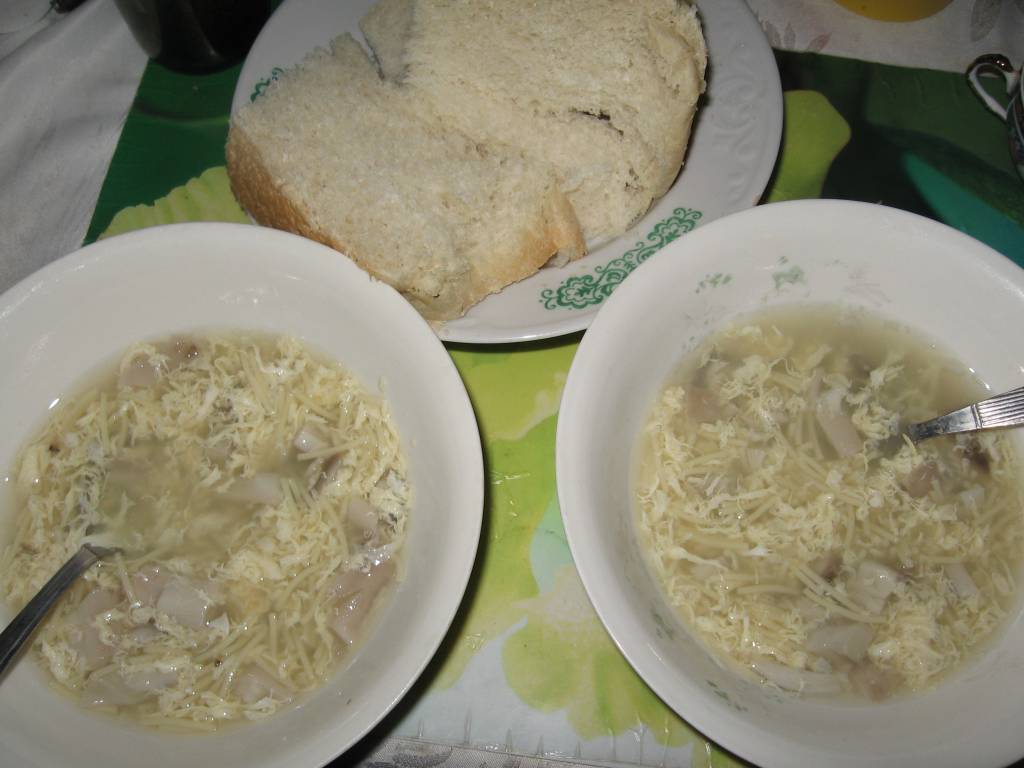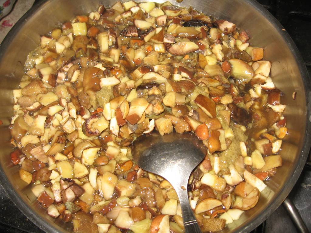 Затем уж, когда таким образом приготовлен вами и горшок, вы начинаете укладывать в него осторожно один сморчок за другим, причем наблюдаете, чтобы между ними оставалось некоторое небольшое пространство, так как они должны будут растянуться и разбухнуть. Проложили один слой - засыпайте его тотчас пармезаном и немного перцем; в это же время вы кладете осторожно одну или две корочки булки, натертой чесноком...
