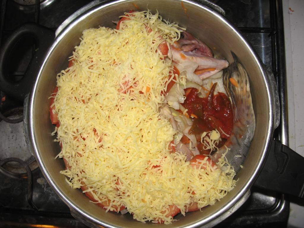 На дно скороварки помещаем слоями часть лука, часть помидорки и часть тертой морковки. Выкладываем тушку горбуши, в брюшко ложим остатки тертой моркови, немного лука и порезанное дольками масло. На спинку горбуши выкладываем дольки оставшегося лука и помидорки. Посыпаем это дело тертым сыром. Поливаем рассолом, ложим ложку лечо. Заливаем небольшим количеством воды, так чтобы слой овощей покрылся только. Ставим скороварку на медленный огонь на 40-60 минут. Рыбка получилась сочная, косточки мягкие, а ее такая резиноватая шкурка так почти совсем растворилась.