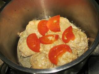 Посыпаем тефтели тертым сыром и укладываем на каждую по дольке помидорки. Заливаем водой до уровня решетки и ставим тушиться на 20 минут. Даем остыть, не снимая давления - и блюдо готово.