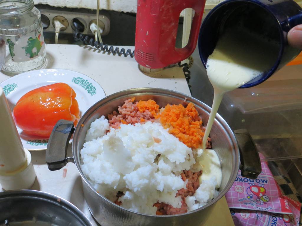Рыбу моем, чистим и потрашим. Потом отделяем филе. Прорезаем ножом шкуру вдоль спинки, а потом, подковыривая тем же ножом, отделяем мясо от позвоночника. Повторяем с другой стороны. По вкусу можно отделить шкурку от филе. Пропускаем филе через мясорубку, завершая процедуру луковией и морковкой. Отвариваем рис до полуготовности и добавляем в фарш. Взбиваем в отдельной посуде яйцо с раст.маслом до устойчивой пены и выливаем в фарш.