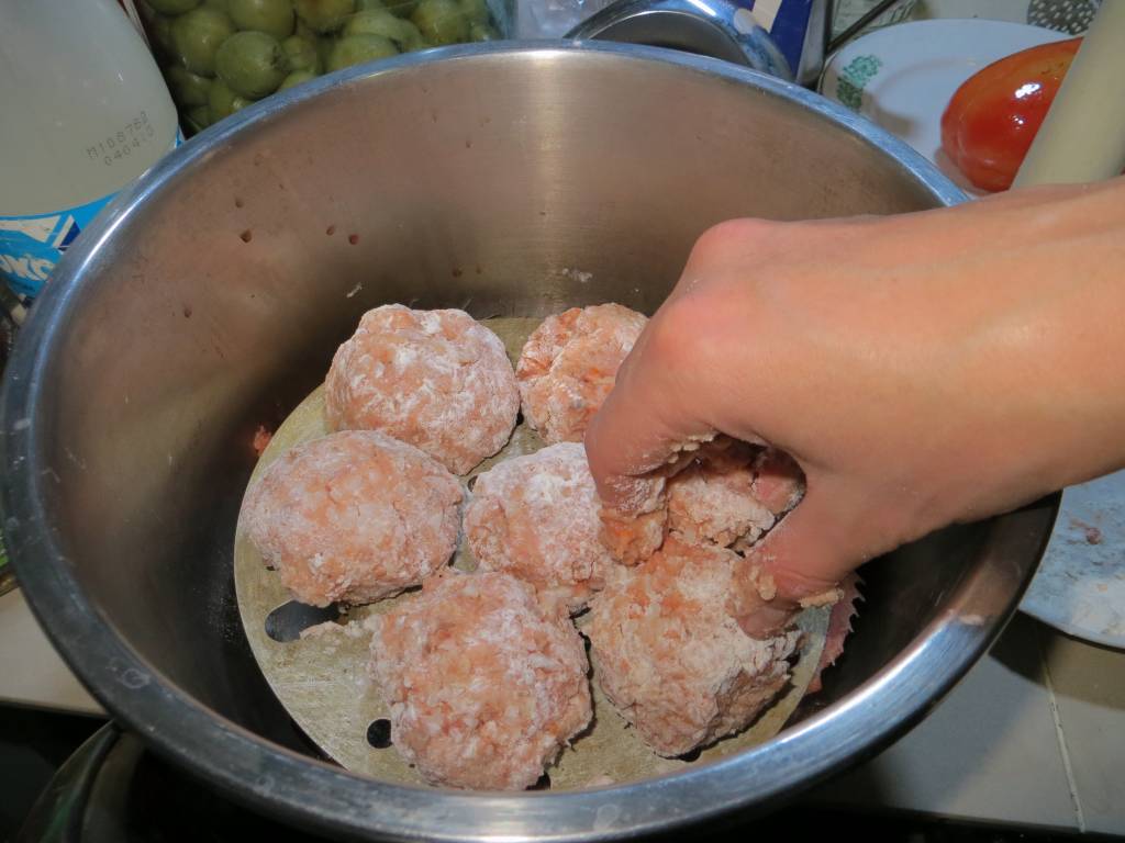 Все перемешиваем, лепим тефтельки, обваливаем в муке и выкладываем на решетку в скороварку.