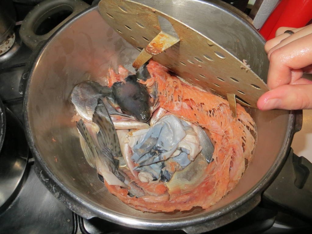 Под решетку укладываем отходы переработки рыбы: шкурку, голову, хребет, плавники, хвост.