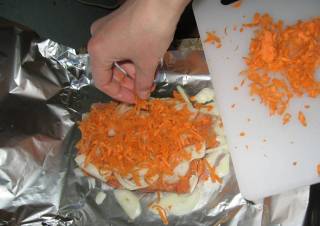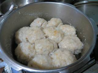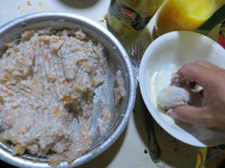 Тефтельки мы готовили на пару в скороварке, так что при разделке мяса рыбы от костей, мелкие кости не отделяли, они все равно в скороварке растворились. Отделив со спинки и хвоста мясо, прокручиваем в мясорубке, добавив к фаршу 1 морковку и 1 головку лука, прокрутив их тоже на мясорубке. Немного отвариваем риса до полуготовности. Фарш солим, добавляем рис и 1 сырое яйцо. Перемешиваем и катаем шарики, обваляв их в манной крупе. В скороварку укладываем решеточку, на нее тефтельки. Заливаем водой до решетки.