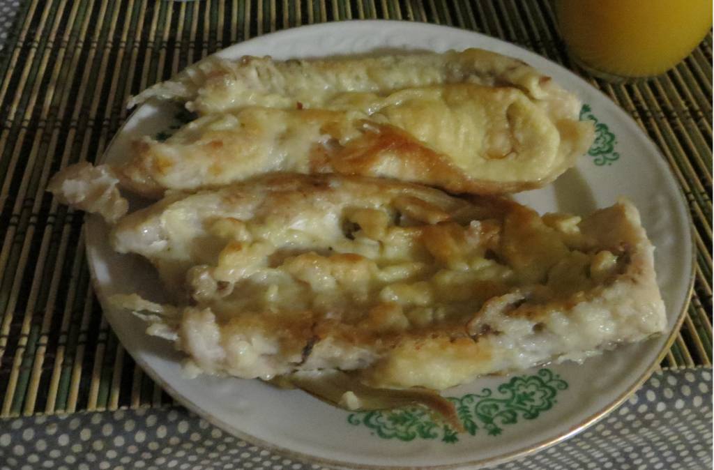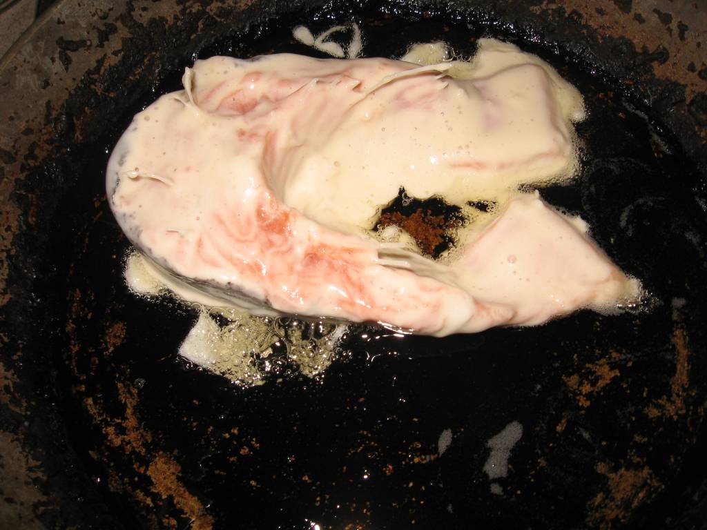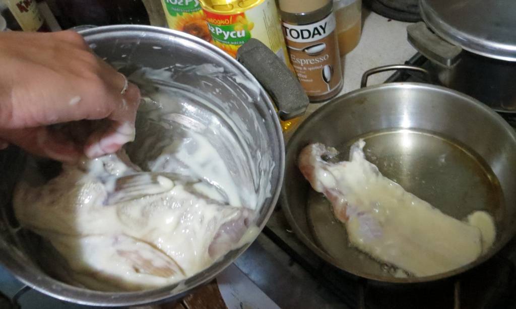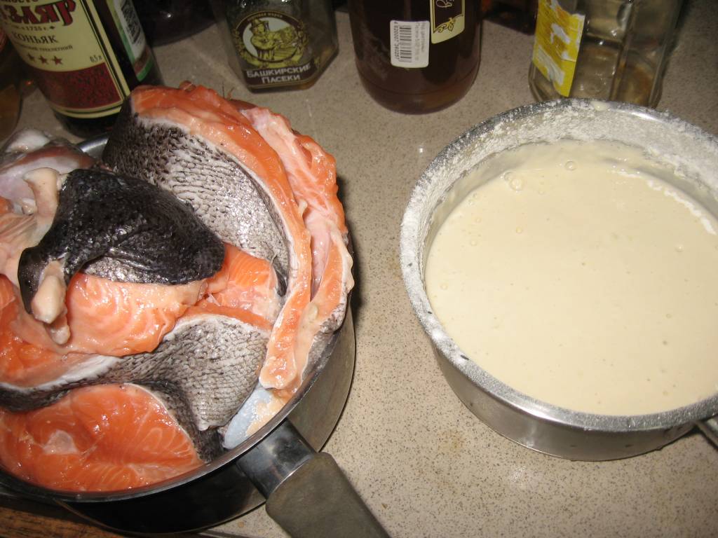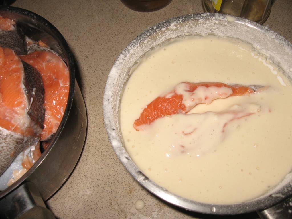 Отделили реберную часть рыбы. Сделали тесто для кляра: 1 яйцо взбитое с полстаканом молока. Добавили соль и муку. Обваляли мясо рыбы в тесте и отправили на прогретую сковороду. Две минуты с двух сторон и готово!