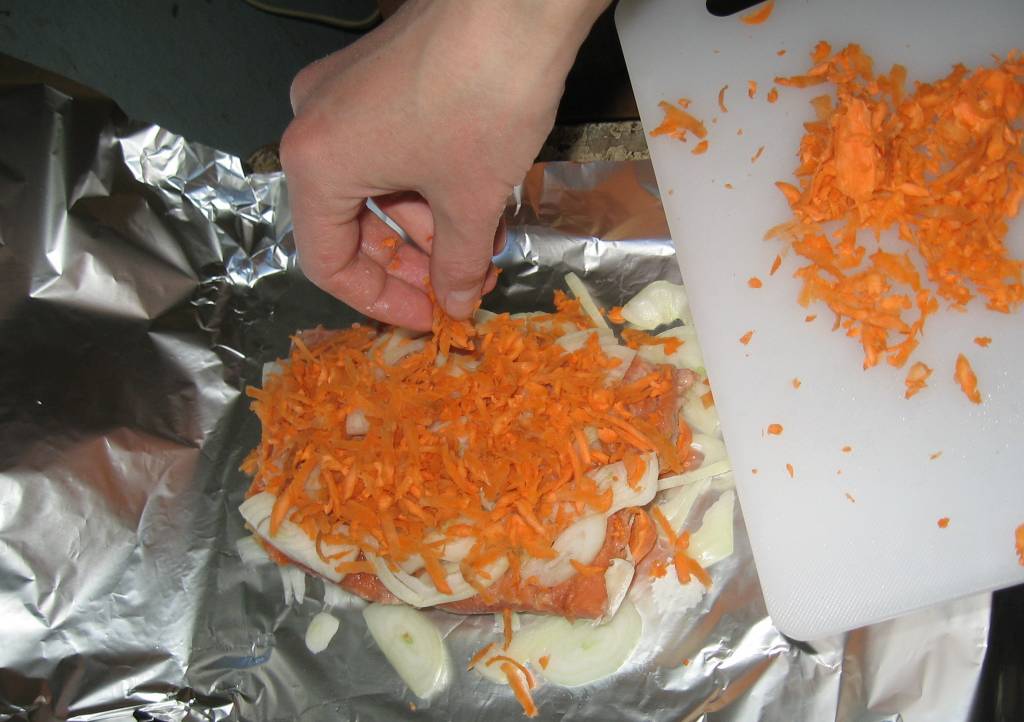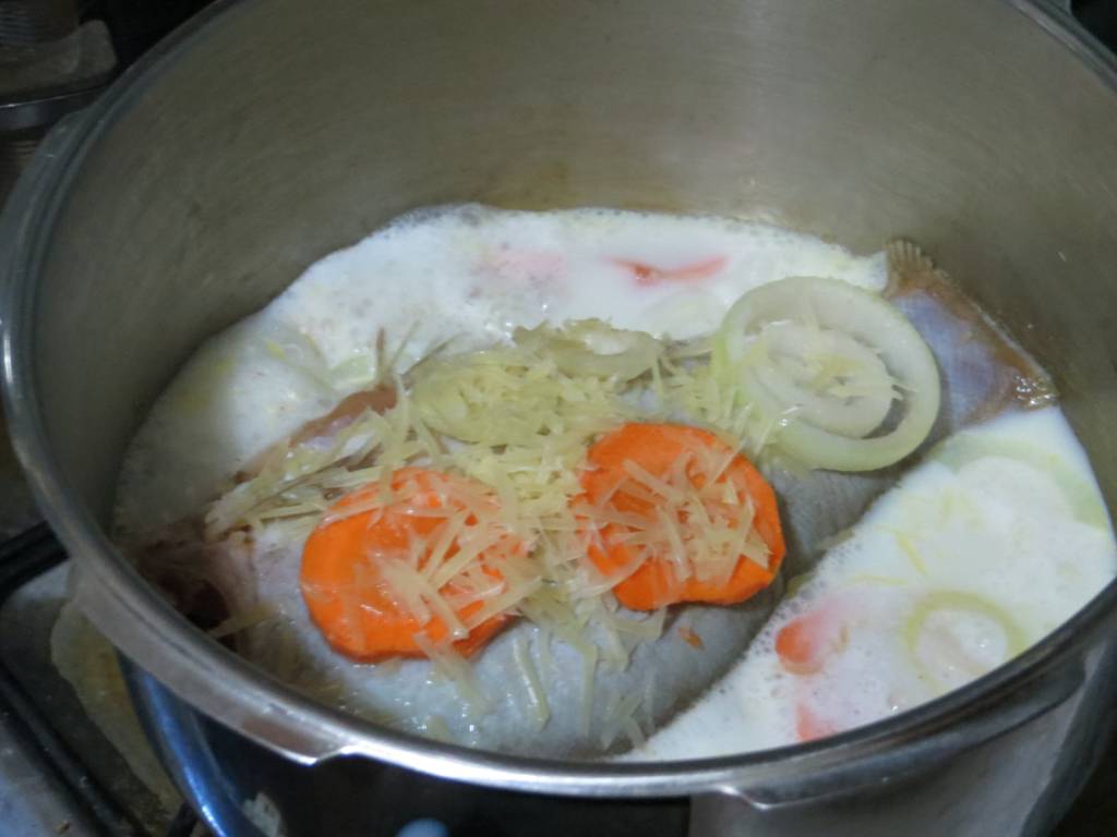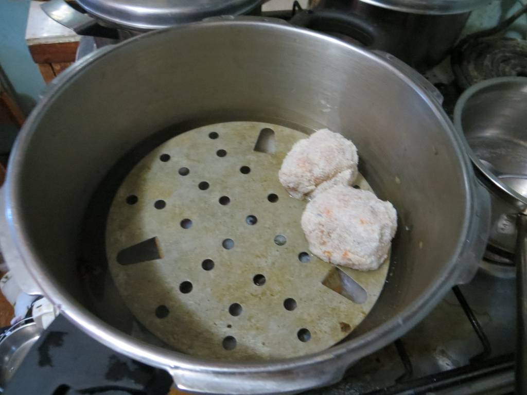 Тефтельки мы готовили на пару в скороварке, так что при разделке мяса рыбы от костей, мелкие кости не отделяли, они все равно в скороварке растворились. Отделив со спинки и хвоста мясо, прокручиваем в мясорубке, добавив к фаршу 1 морковку и 1 головку лука, прокрутив их тоже на мясорубке. Немного отвариваем риса до полуготовности. Фарш солим, добавляем рис и 1 сырое яйцо. Перемешиваем и катаем шарики, обваляв их в манной крупе. В скороварку укладываем решеточку, на нее тефтельки. Заливаем водой до решетки.