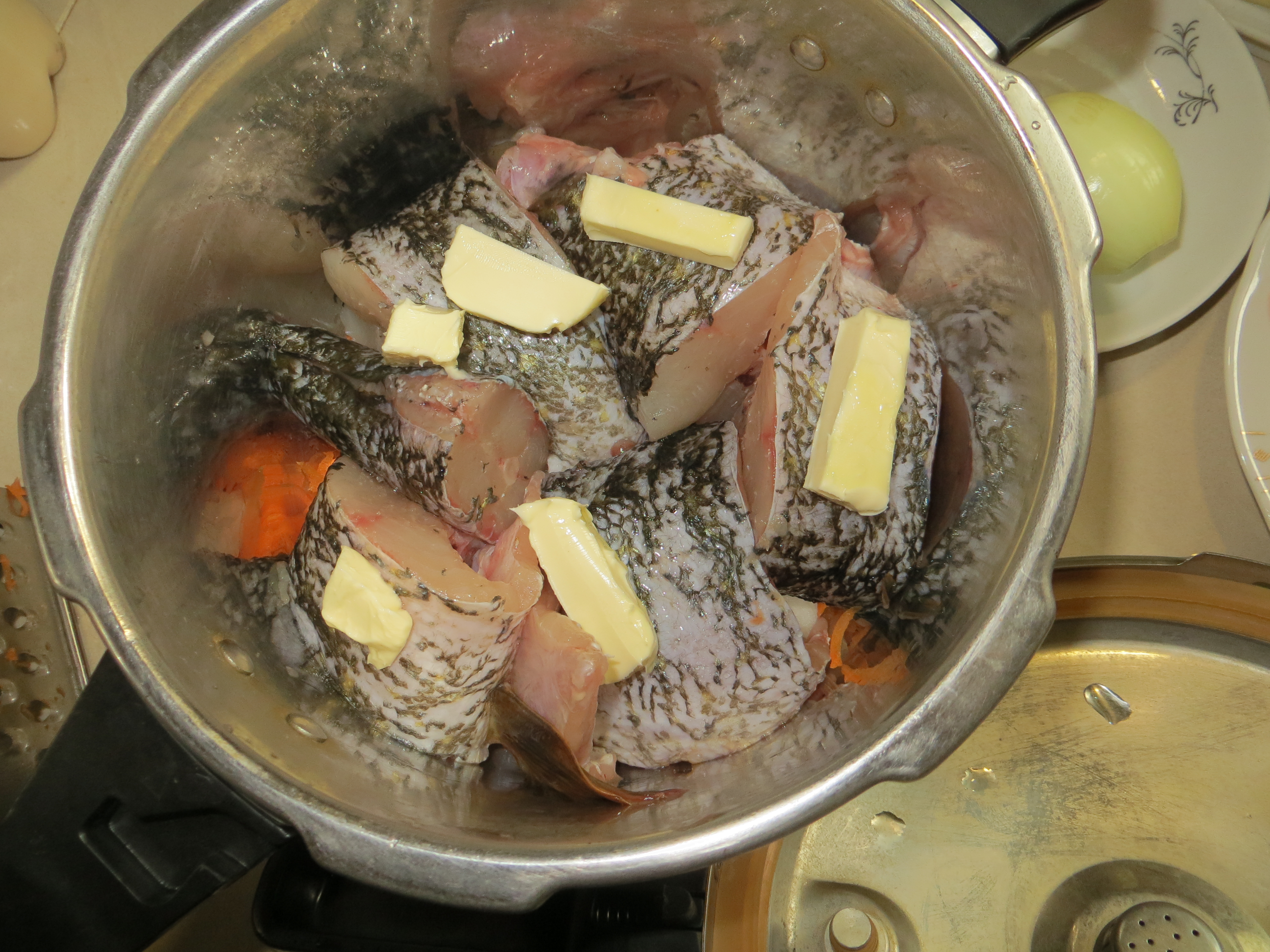 Что еще из головый и хвоста рыбы делать? Конечно же уху! А с готовкой ухи мы поступаем просто. Загружаем в скороварку голову щуки, в морозилке еще были головы каких-то рыб, их туда же. Луковицу и морковь кружочками. Заливаем водой на 3/4 скороварки, солим и тушим 40 минут. Бульон сцеживаем. Добавляем в бульон рис, кусочки рыбы, выбранные из голов, тертую морковь, вареный лук, выдавленный через чеснокодавку. Подсаливаем и варим до готовности риса.