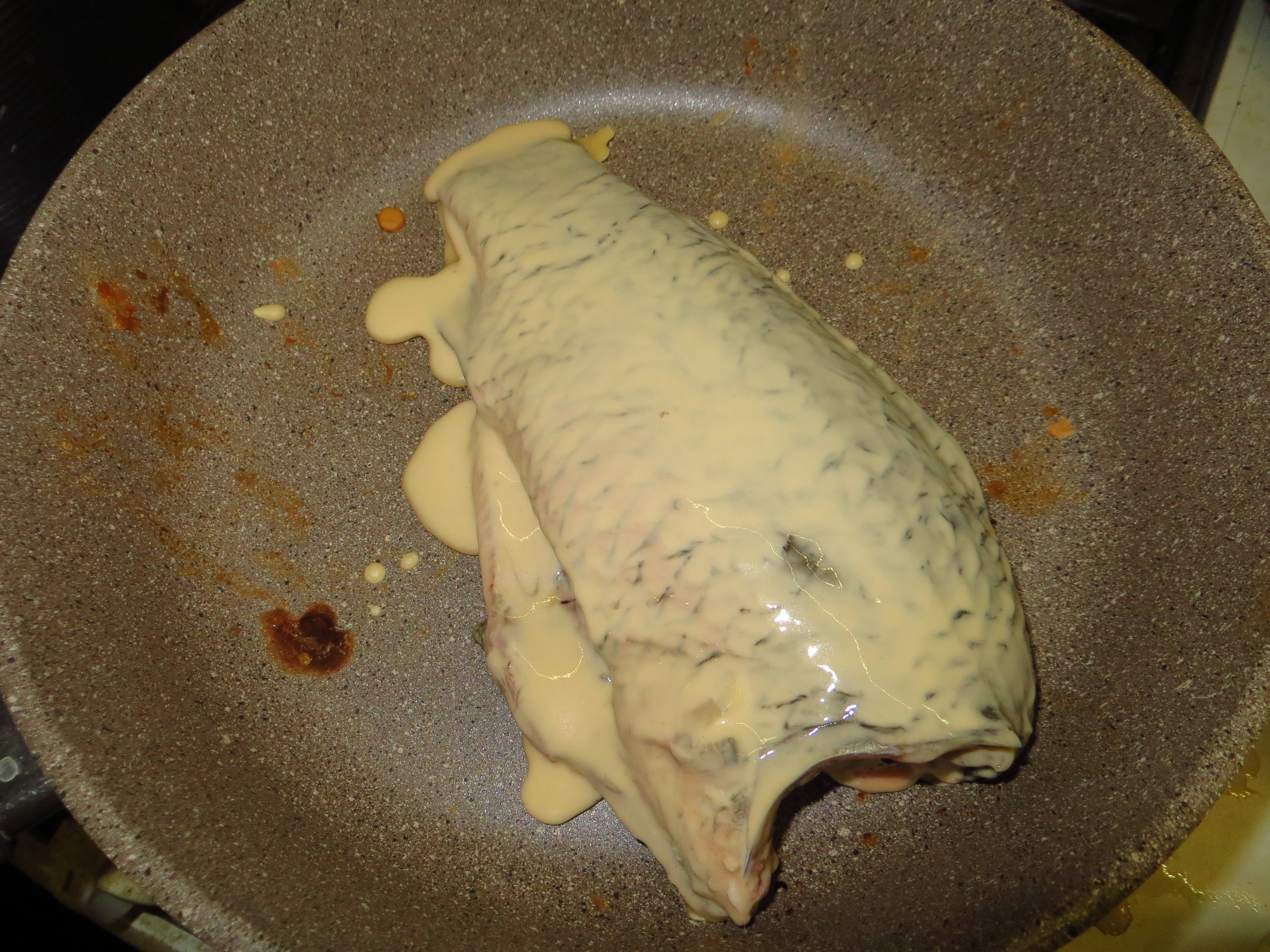 Ставим сковороду, добавляем растительное масло. Куски брюшка обмакиваем в тесто и на разогретое масло. Пять минут с одной стороны под крышкой, пять минут с другой обжарить на умеренном огне. Вот и готово. Немного остудить и подавать на стол.
