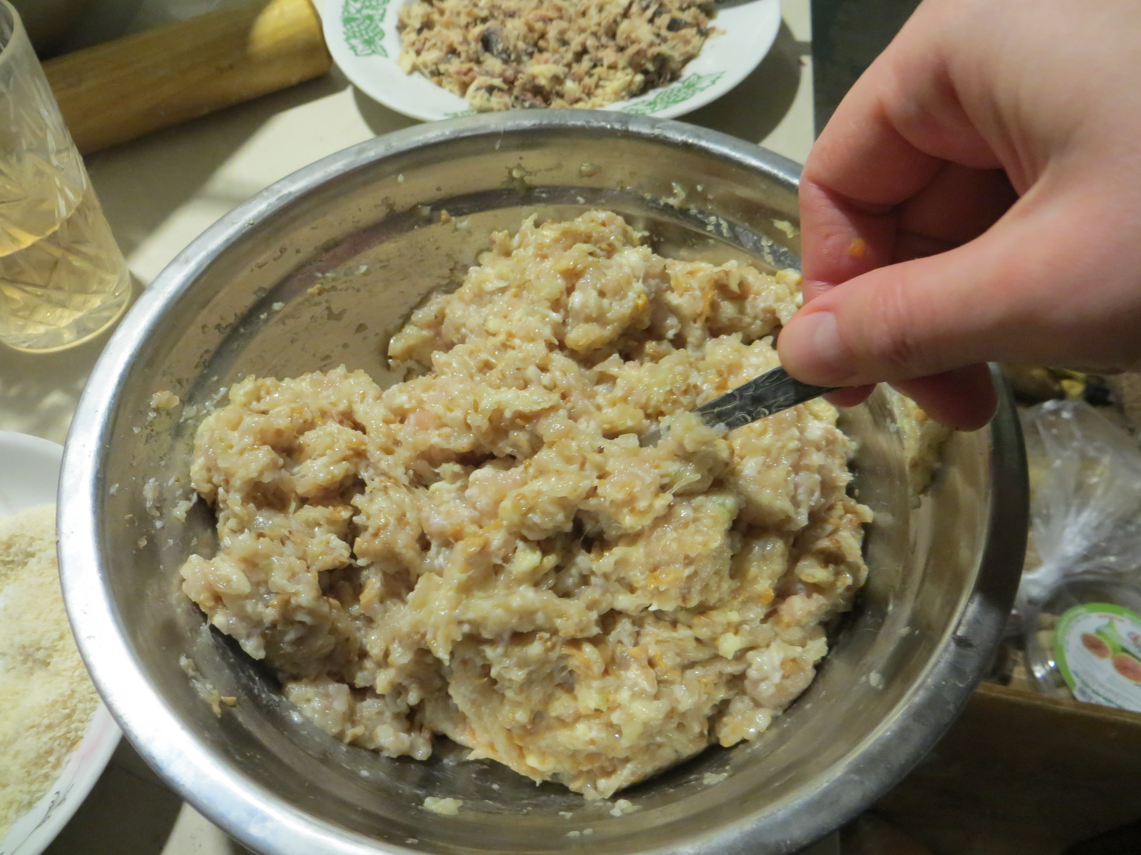 Филе курицы (удобно использовать грудку) свиное сало, головку лука и грибы пропустить через мясорубку.
