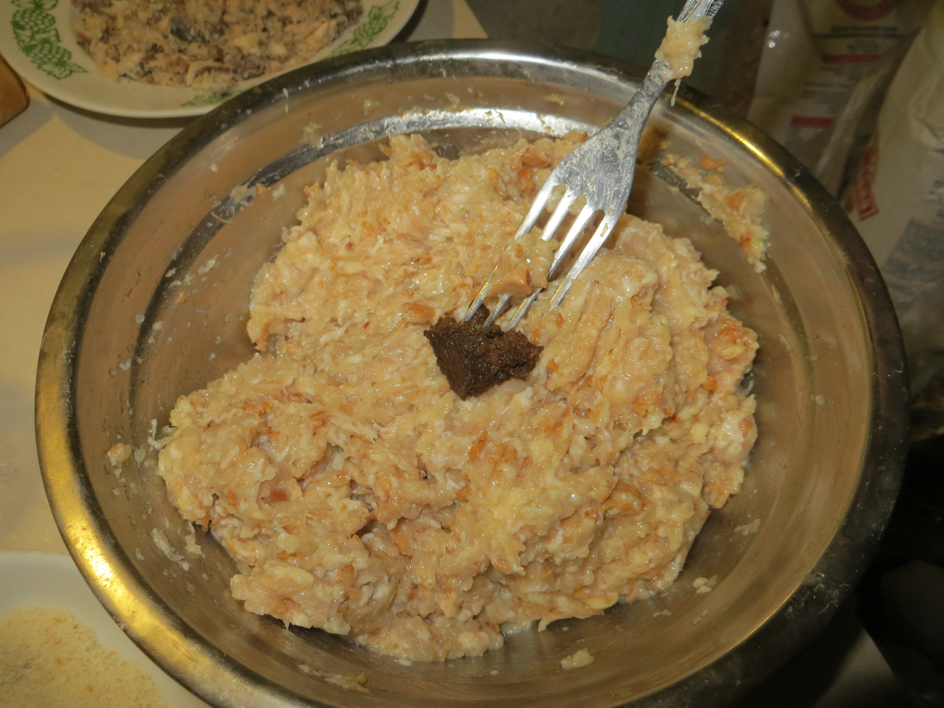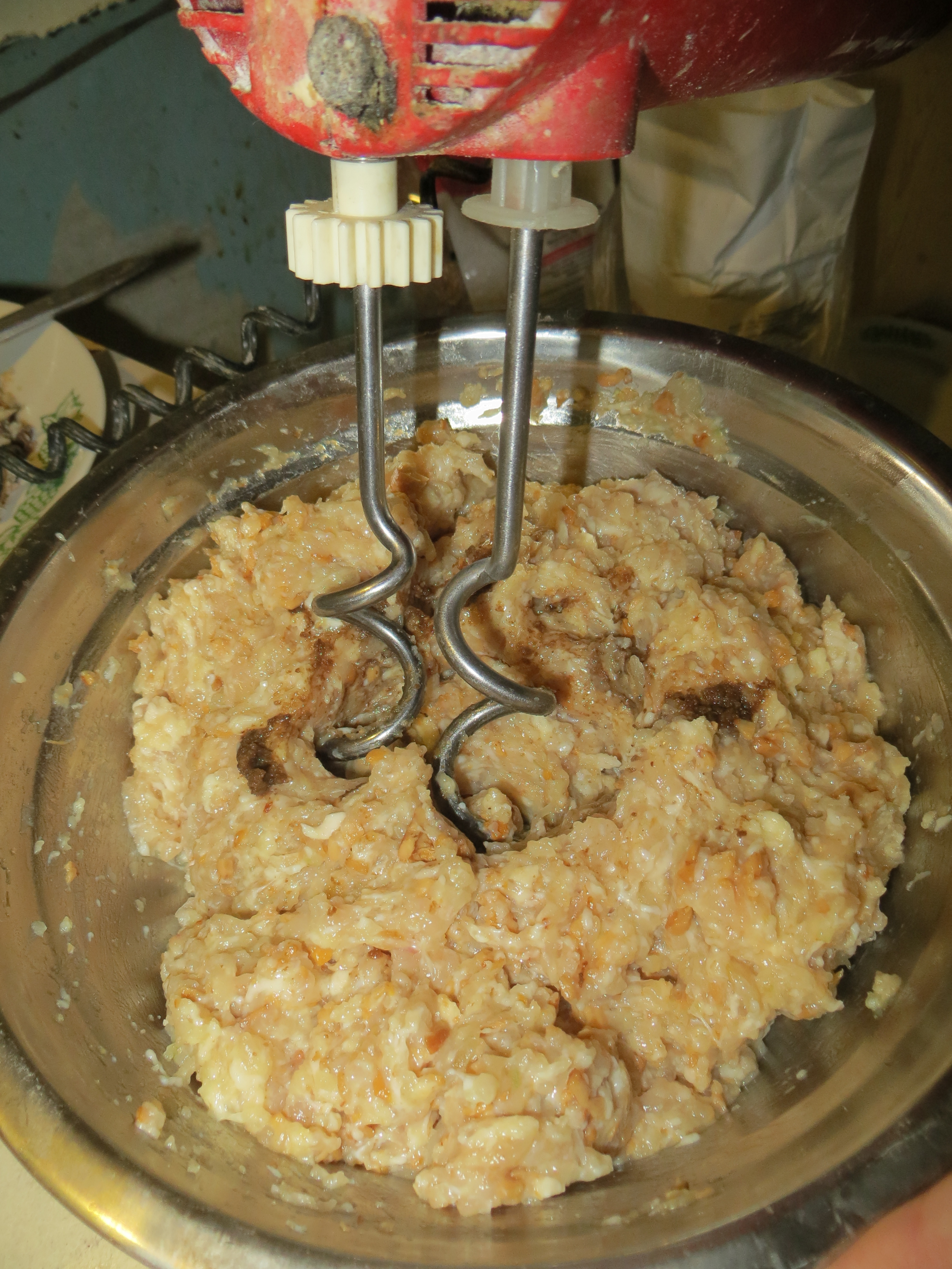 Сухие грибы (красные грузди, дождевик, гриб-зонтик) добавить по шляпке в кофемолку и растереть. Грибной порошок замочить в небольшом количестве воды. Дать постоять, отмокнуть и добавить в фарш. Все перемешать миксером.