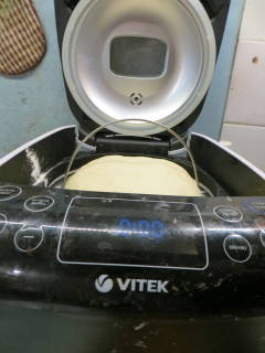 Появилась у нас мультиварка-хлебопечь vitek VT-4209BW. Тесто пробовали сделать по книге рецептов, получилось оно, по нашему вкусу, твердое. Это тесто пошло на пиццу. Внесли изменения в оригинальный рецепт пшеничного  хлеба: добавили яйцо и дрожжи предварительно отстаивали в теплом молоке, а не стали добавлять сухими, как в рецепте.