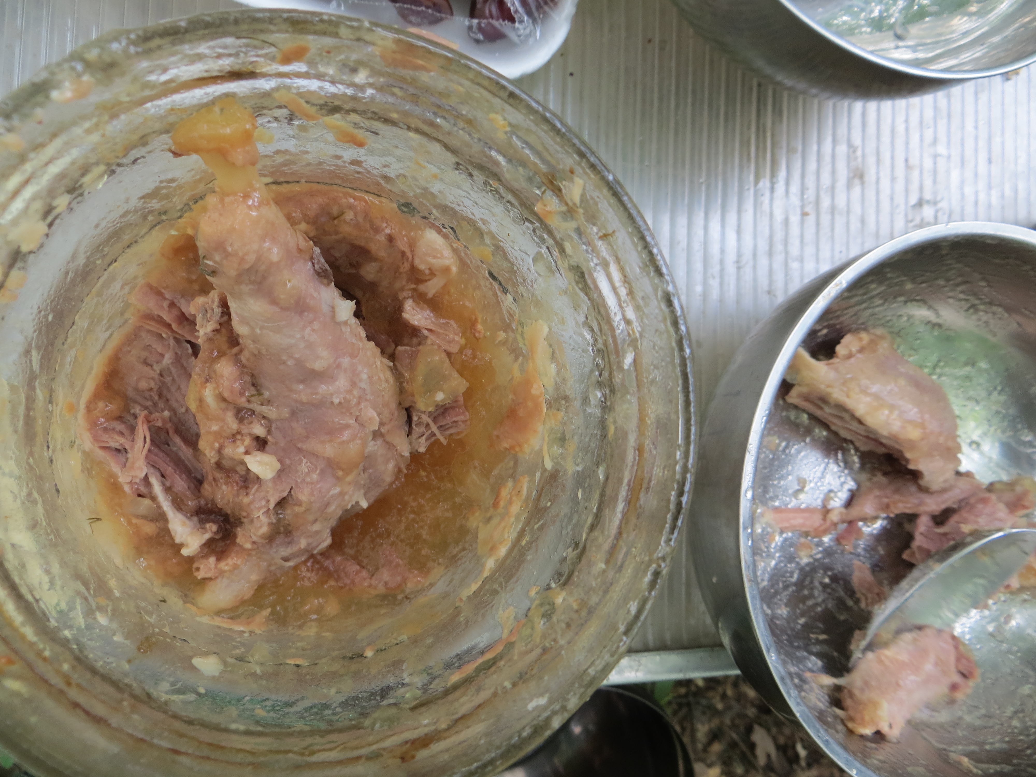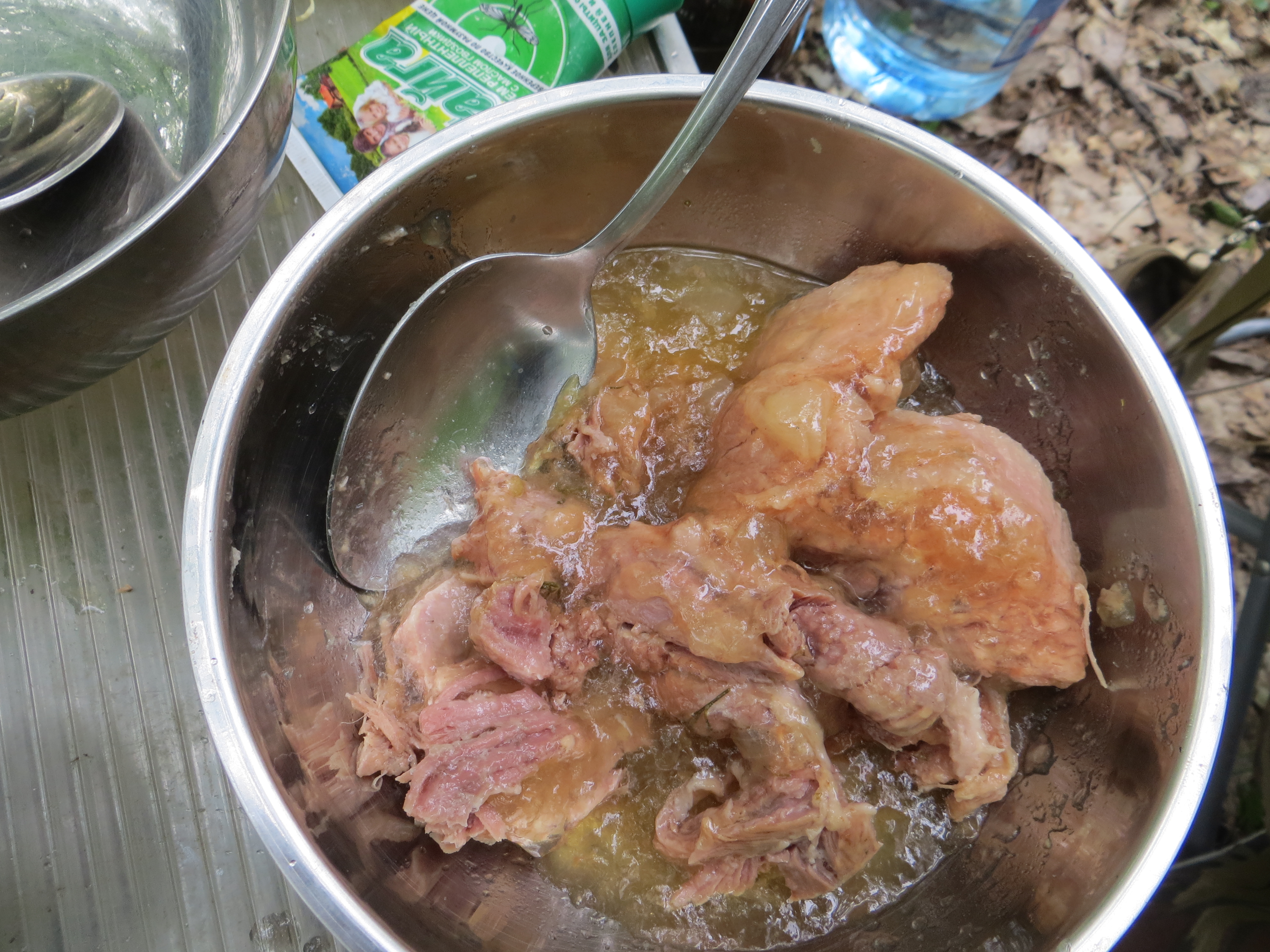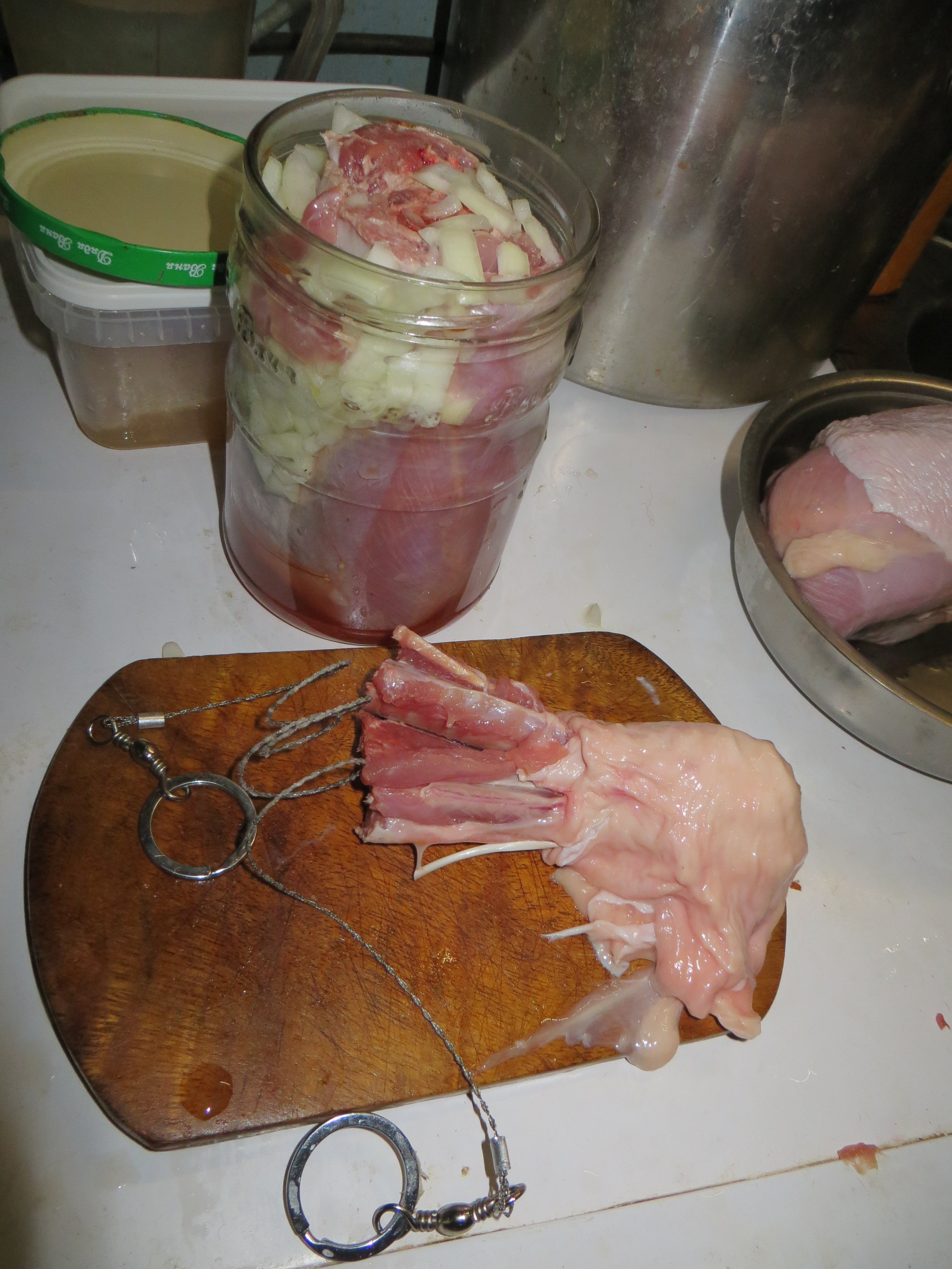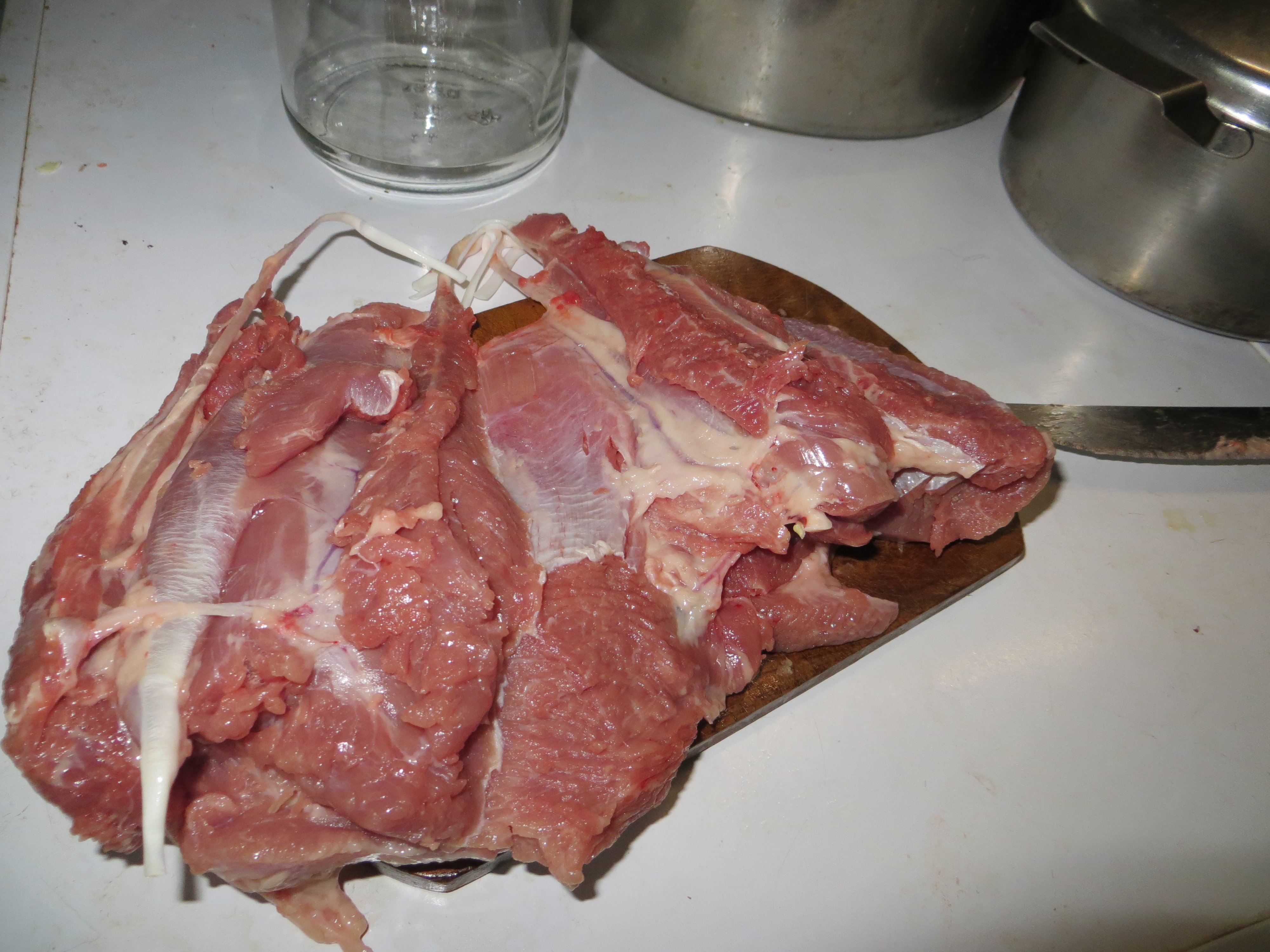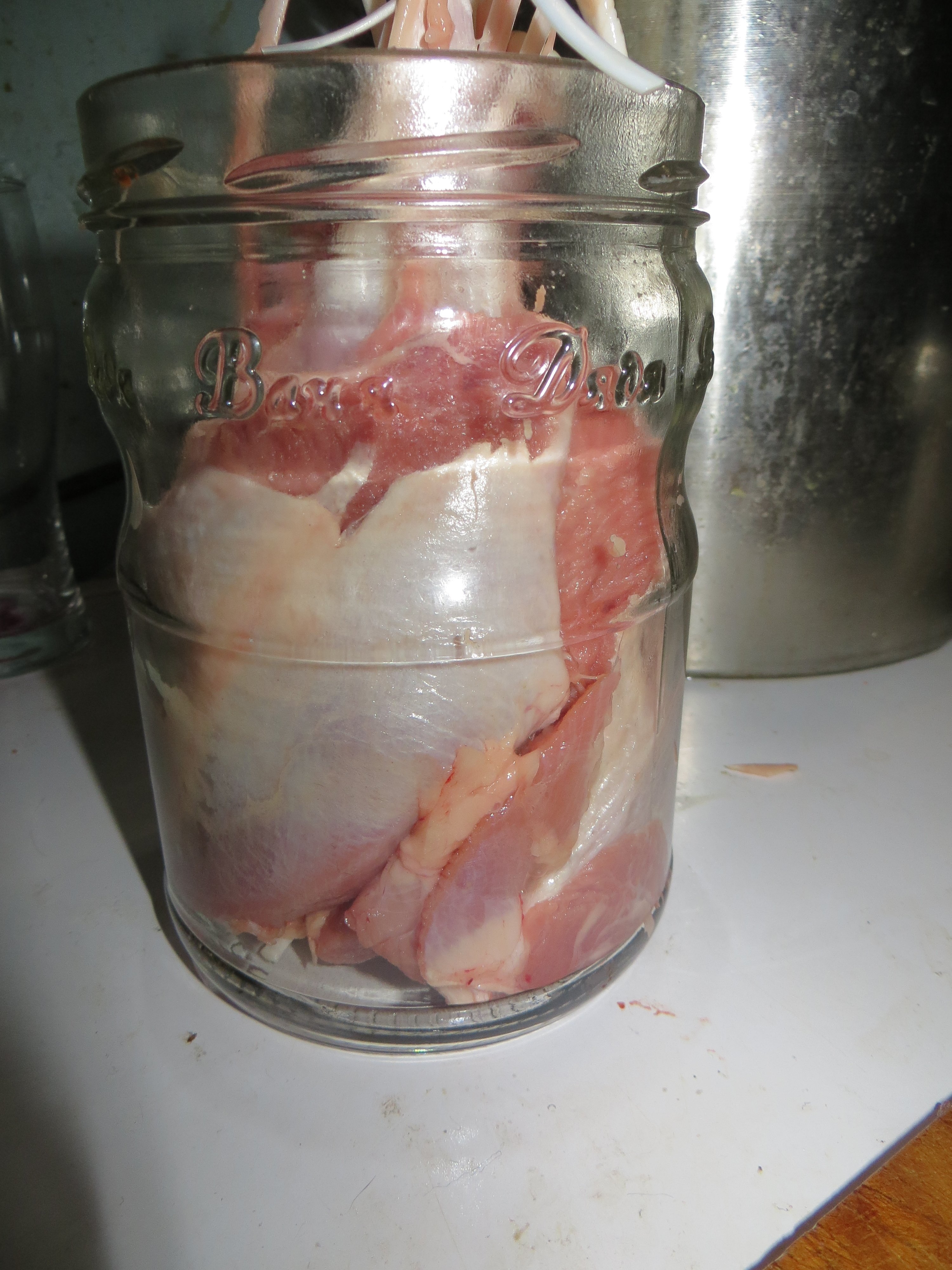 В качестве первой попытки решили консерву делать из индюконоги - вкусное мяско, плюс одна такая нога в банку лезет. Сказано - сделано.