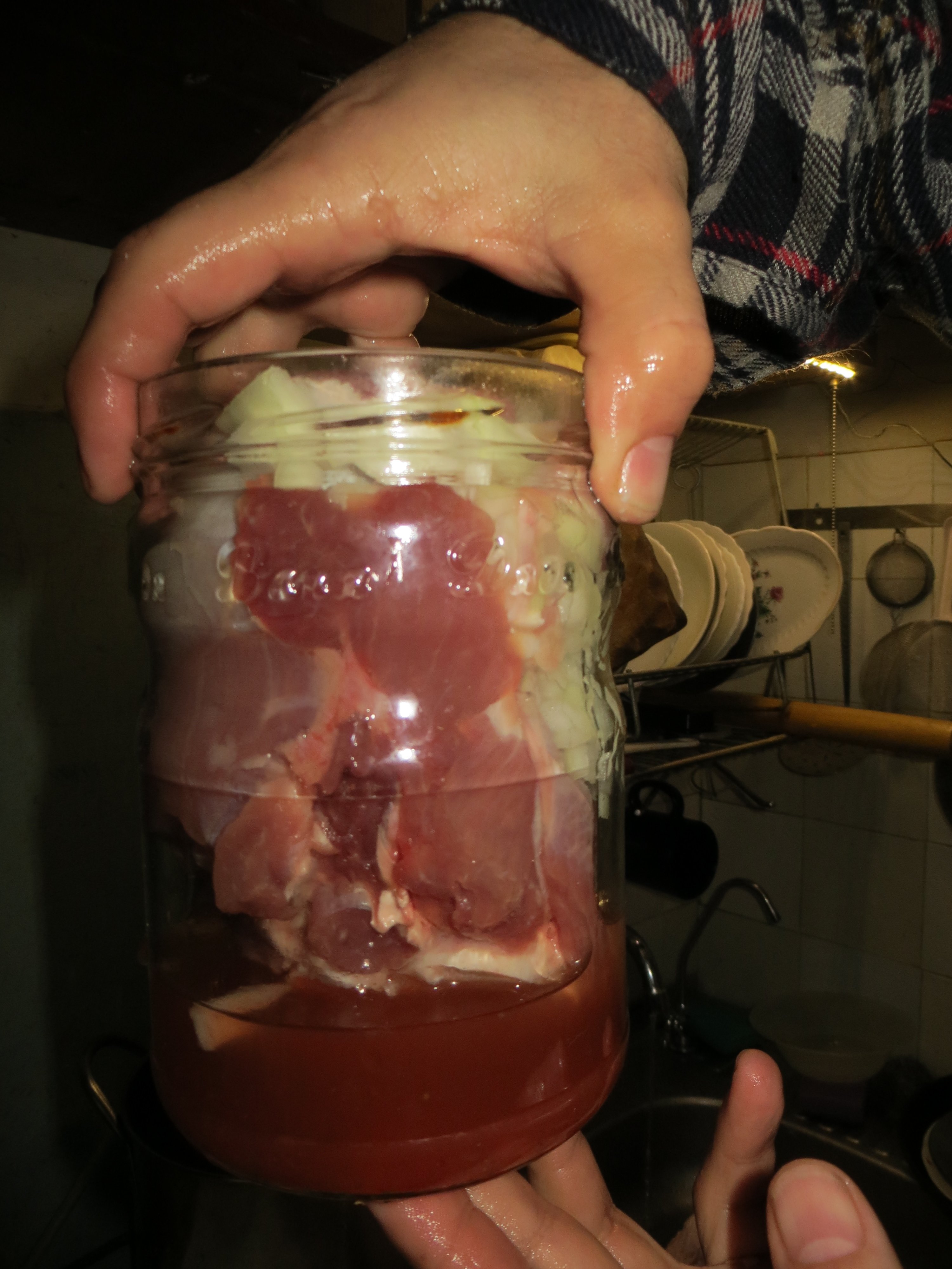 К мяску заливаем полстакана белого вина, столовую ложку кетчупа, ложку от огуречно-помидорного рассола, небольшую головку порезанного лука. Закрываем крышкой и помещаем в скороварку. На дно скороварки обязательно положить сеточку металическую и залить водой, почти до горла банки. Закрываем и ставим на огонь до закипания.