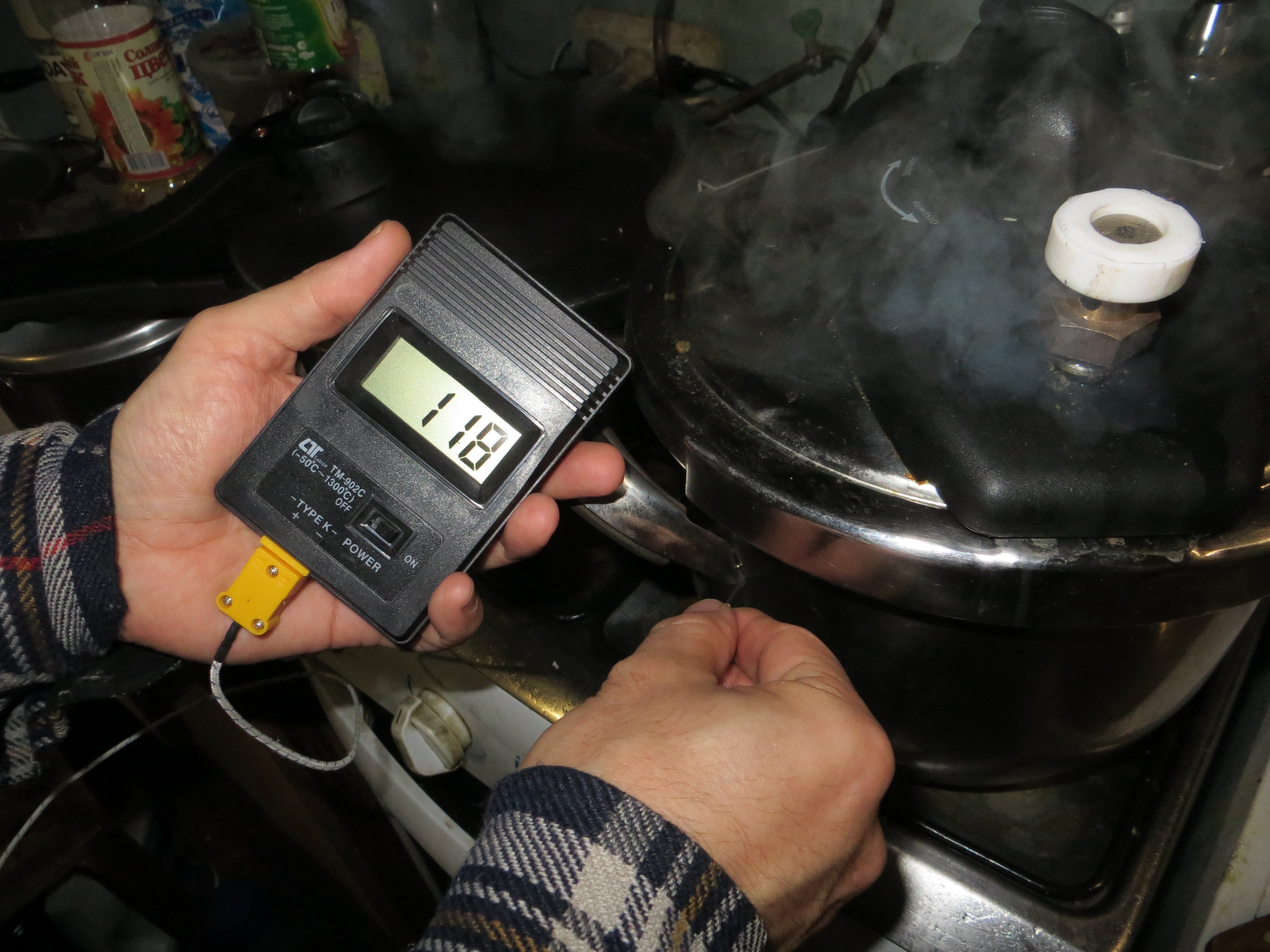 Измеряем термопарным термометром температуру ручки - 118 градусов, это где-то на два градуса меньше чем внутри. Значит всё отлично - 120 градусов внутри скороварки. Тушим полтора часа. После этого даем остыть, и на следующее утро открываем крышку скороварки. Достаем банку, любуемся результатом и проверяем крышку - она должна присосаться к банке.