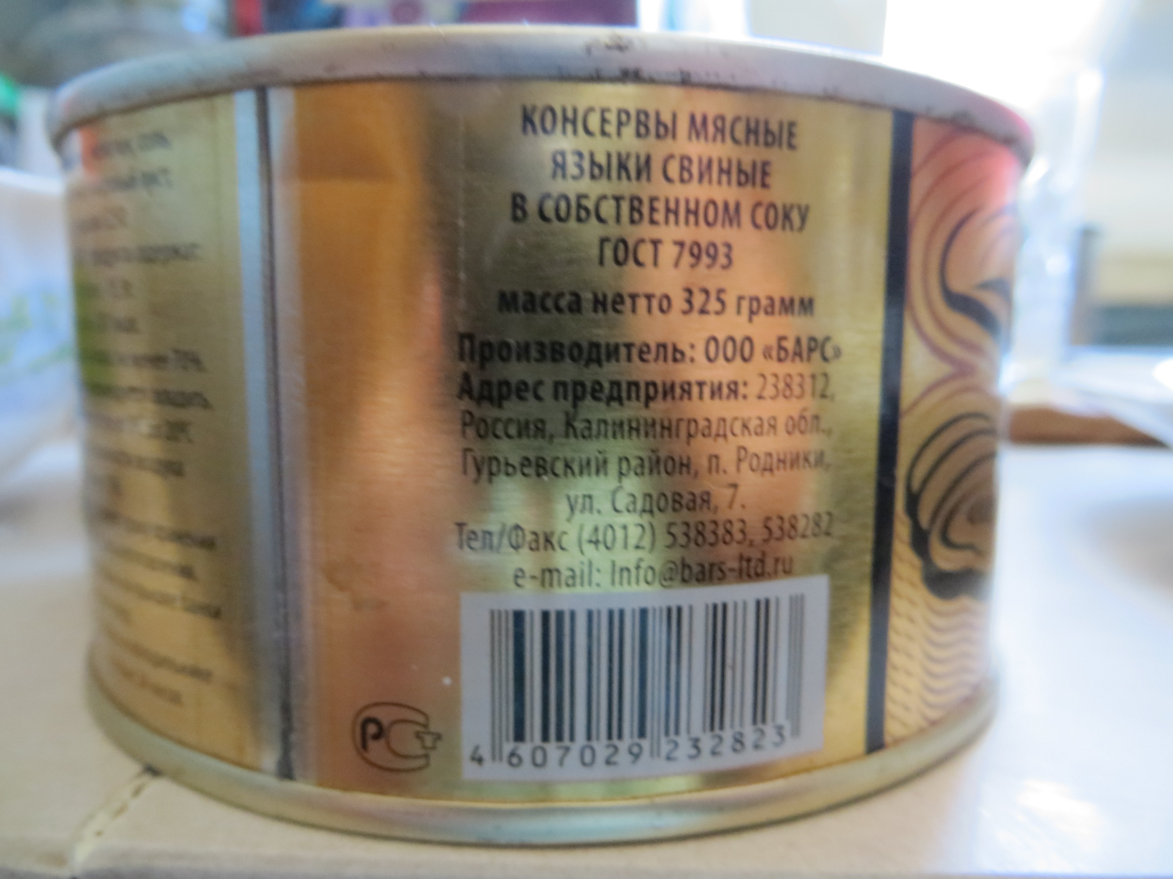 Языки свиные в собственном соку и языки говяжьи в желе. ООО "Старорусский мясной двор", Новгородская обл., г. Старая Русса. Цена примерно 100р за банку.