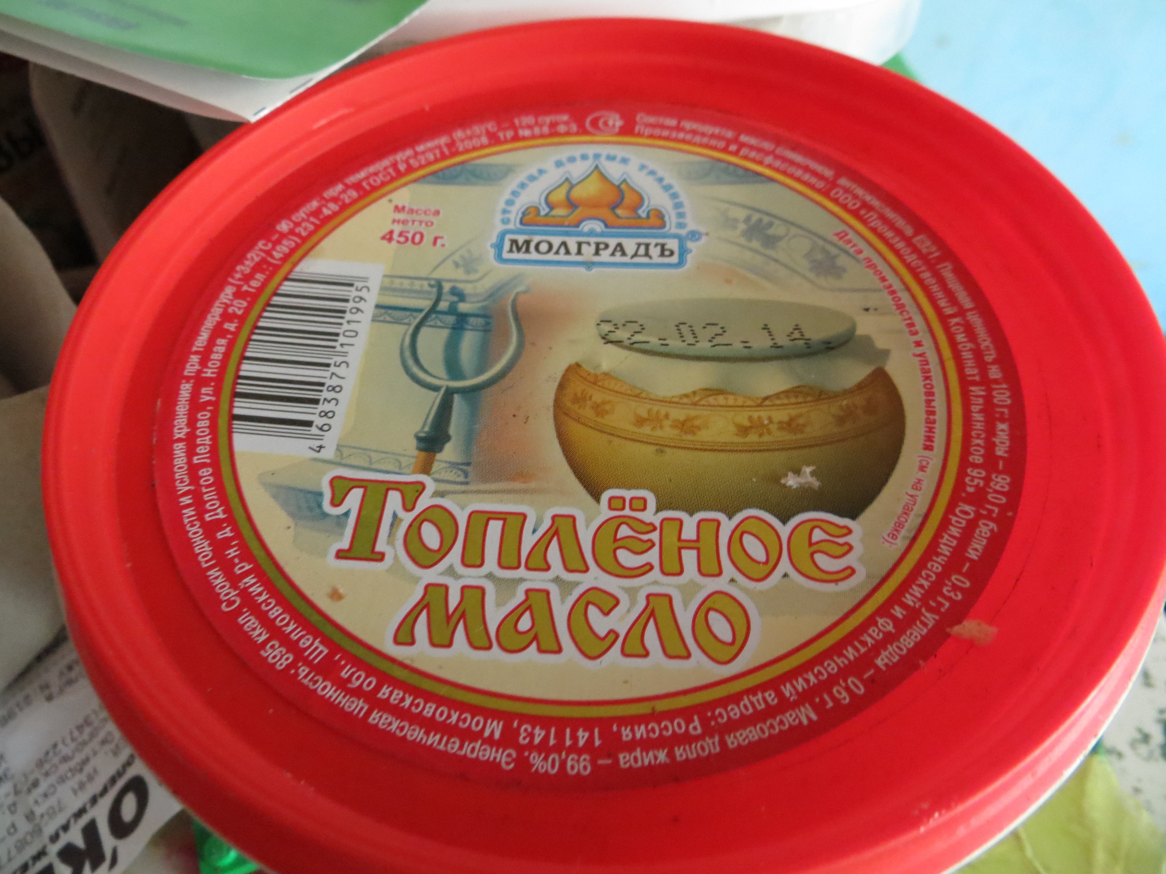 Топленое масло - натуральное! Не заменимо для всяких кашек, грибов да блинов на природе. Брали в Ленте цена около ста рублей 450г ведерки.