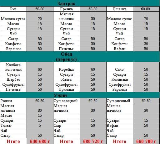 В низу долно быть строчка "на человека в день", при чем не только по весу, но и по жирам, белкам и углеводам. Это даст возможность контролировать правильность составления раскладки: в идеале, итоговый вес должен получаться для простых походов грамм 600-700 в день на нос. Велосипедисты - отдельная тема, они ж еще и мотором работают - зато у них и рюкзак не на спине