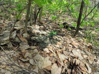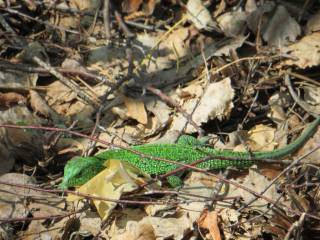 Шли минуты. Существо не выползало из своего укромного места, отчаявшись, я уже собиралась идти дальше по своим грибным делам. Как вдруг зашуршало, но не около пня, а дальше, воон около того дерева. Что-то ярко-зеленое и большое.