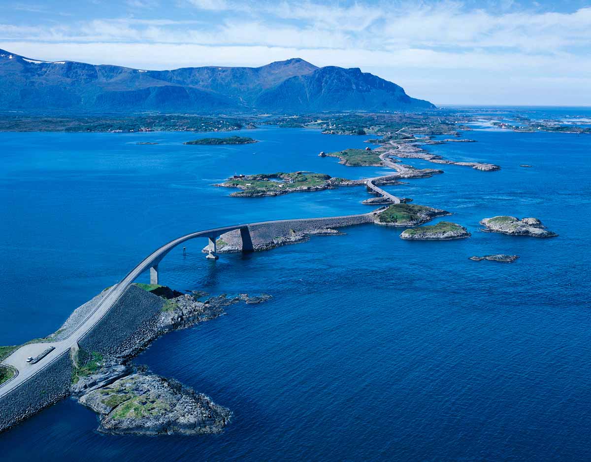 Атлантическая дорога в Норвегии - самое грандиозное сооружение 20-го века этой страны. Постоена она на нескольких островах и шхерах. Дорога включаетс в себя 8 мостов и 4 смотровые площадки. Длина шоссе составляет 8,3 километра.
