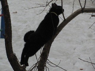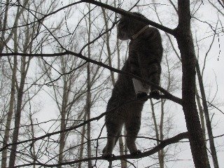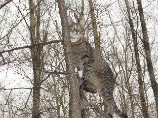 А мы лазием :). Вспомнился случай прошлого года, как Котю впервые вывезли на природу. На третий день Кот освоился - от лагеря далеко не отходит, где-то рядом шуршит в траве - за ужиками охотится. Темнеет. Кота нет. Позвали - не откликается. Ложимся, прислушиваемся к шорохам. Первые два дня Котя спал в палатке - сам заходил в оставленную щель и укладывался. А в эту ночь не пришел. Всё, думаем, в лес убежал, заблудился, а там дикие звери... Самим страшно за кота. Вдруг где-то раздается жалобное и тихое мяу. Подумала глюки, но глюки повторились через некоторое время. Вышла из палатки, темно, ничего не видно, позвала - где-то высоко слышно голос. Фонарь в то направление - О, светятся два шарика. Нашелся! Сидит на ветке дерева, на уровне как раз второго этажа, и слезть боится.  Муж решается его снять. А как? - Залезть на дерево! - А как? Дерево толстое, высокое, первая ветка, на которой собственно сидит Кот - это второй этаж. Одевает штаны, чтоб ноги сильно не ободрать и, обняв ствол дерева руками и ногами, подтягивается вверх. Так и добрался до Коти, а тот вцепился в свою ветку и ни в какую сниматься не хочет. Что делать? Слезать с дерева и что-то еще придумывать. Нашли подходящее бревно, которое доставало до ветки, на которой сидел кот, поставили по диагонали - и уговорами, таки выманили Котю с насиженного места. Всё. Всем в палатку и спать! На следующее утро, этот мохнатый снова залез на дерево и снова слезть с него боится. Ладно не высоко - сняли. Видимо ему понравилось, и он залез на наклонное дерево. И самостоятельно! слез него, гордо возле нас прохаживаясь. Потом уже залез на то ночное дерево еще выше и благополучно с него слез. Вот так Кот и научился лазить по деревьям.