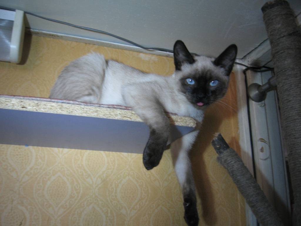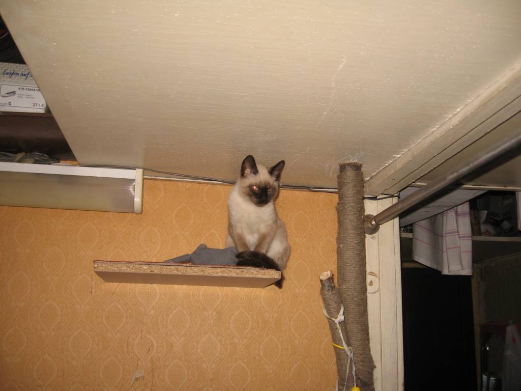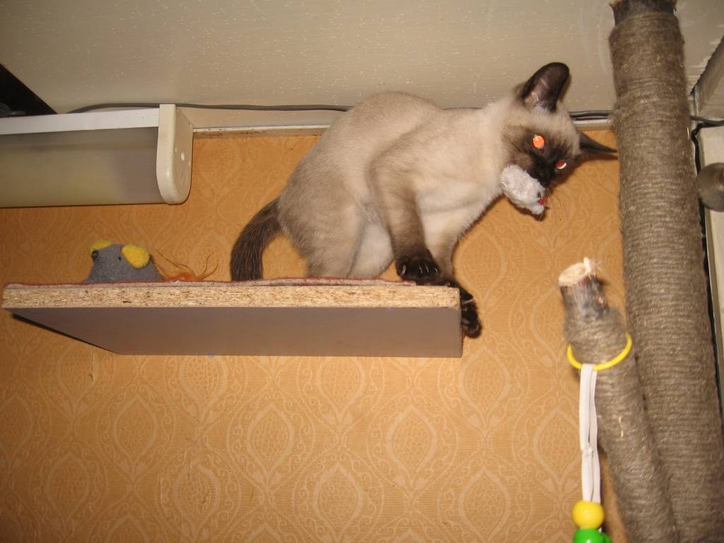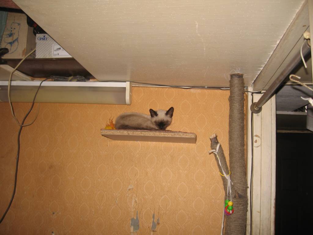 У нас новую кото-игруху папа сделал - полочка, обитая ковром. Первые несколько минут Кот коряжился на ней - с полочки на дерево слезать побаивался, а потом освоился, что играть там начал, правда, пару раз чуть не улетел, но зацеплялся за коврик и благополучно подтягивался на полочку.