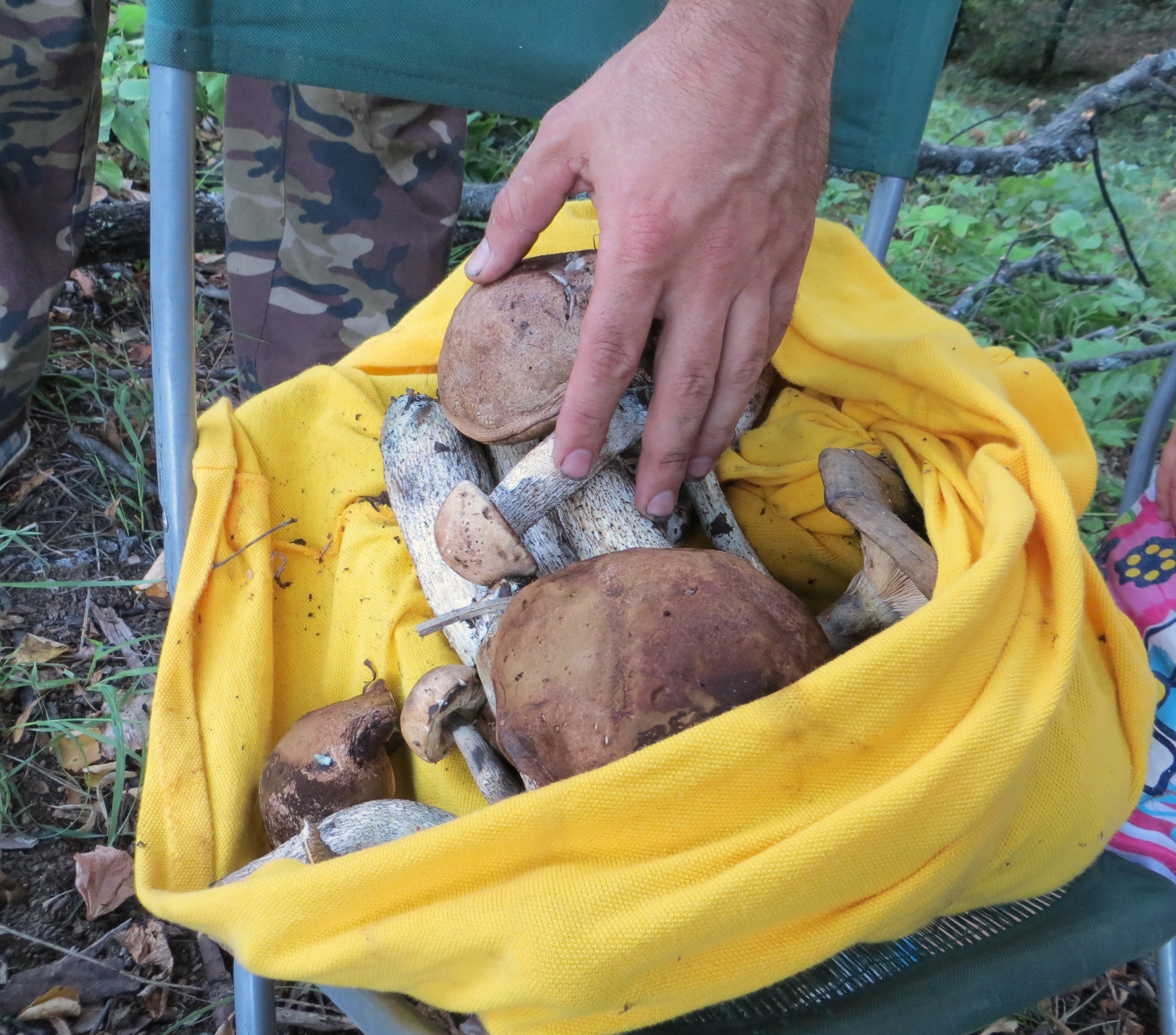 муж заглянул на минутку в маленький лесочек посреди поля и вышел оттуда, неся футболку полную грибов.