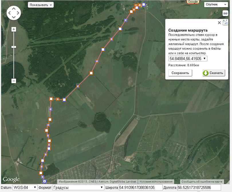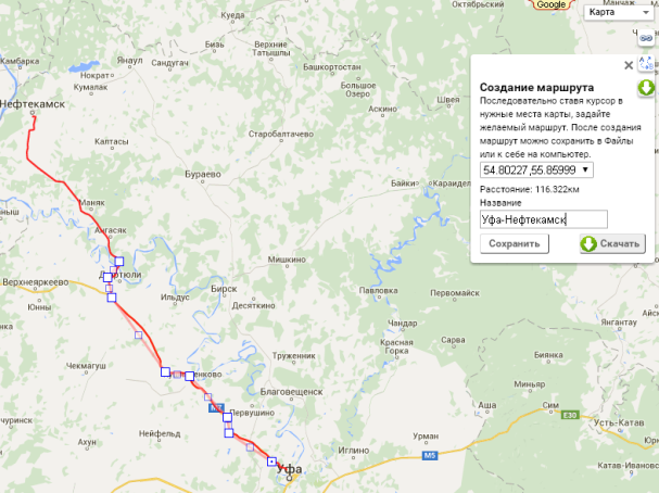 после нажатия на которую карта переключается в режим создания маршрута - клики по карте запоминаются и отображаются на карте (в точности как создание линий в редакторе карт). Полученный маршрут можно либо сохранить к себе в Файлы, либо сразу же скачать на компьютер. Пока доступен лишь формат маршрута ОзиСЕ, как самый востребованный - но в ближайшем будущем будет предоставлен выбор формата.