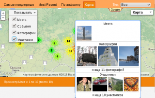 В левом верхнем углу карты выросла кнопа "Показывать", нажимаем - открывается список всех доступных геообъектов (места, фотографии, участники и т.д.) с галочкой. Если галочку поставить - объекты будут показаны, если убрать - скрыты. Все просто