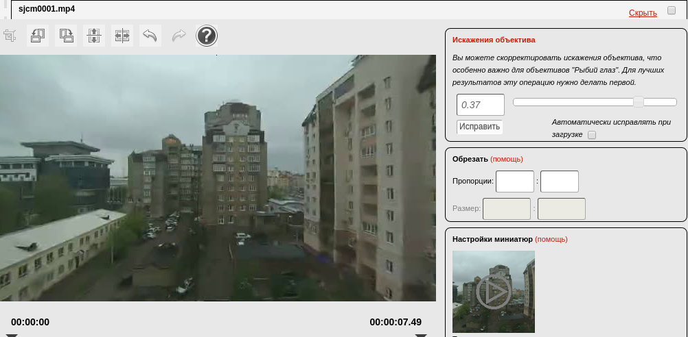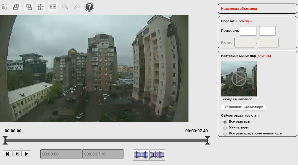 Как и для фотографий, есть возможность отражений, поворотов и обрезки кромок. Также есть возможность скорректировать искажения объектива экшн-камер, причем в отличие от фото коэффициент коррекции всего лишь один, и его легко подобрать вручную. Конечно, такая схема коррекции менее точнА чем использованная для фотографий, но и ее точности для видео хватает с избытком.