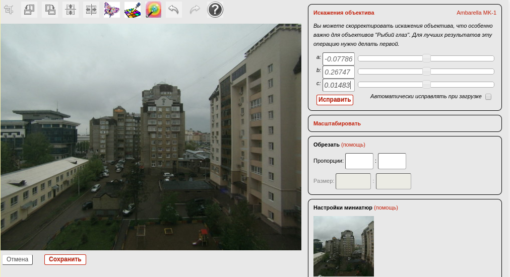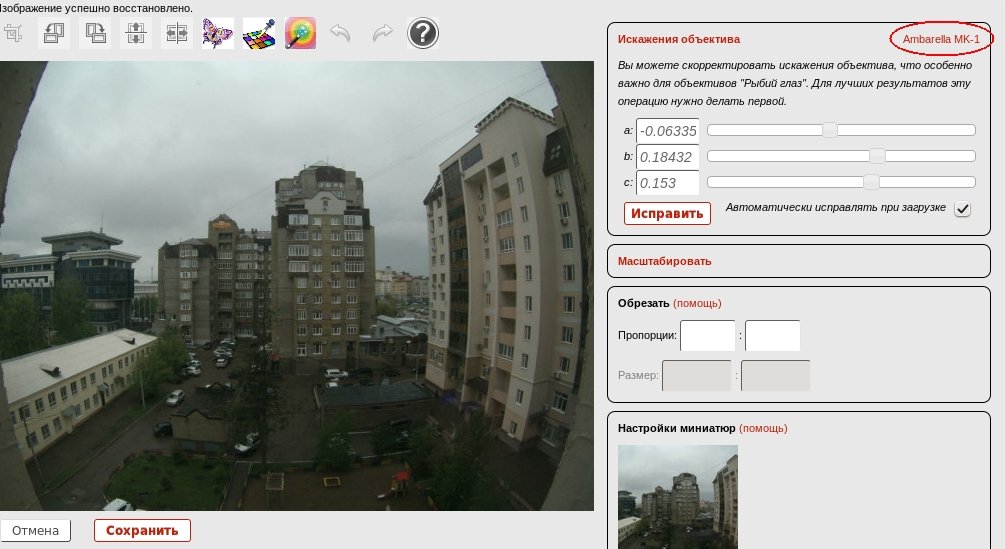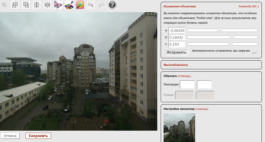 Изображение оказалось несколько обрезано по краям, но это можно простить. А теперь самое время для плюшек! Потому что сейчас, убедившись в правильности преобразования, можно поставить галочку "Автоматически исправлять при загрузке", и больше никогда не видеть кривых прямых на фотографиях с этой камеры!