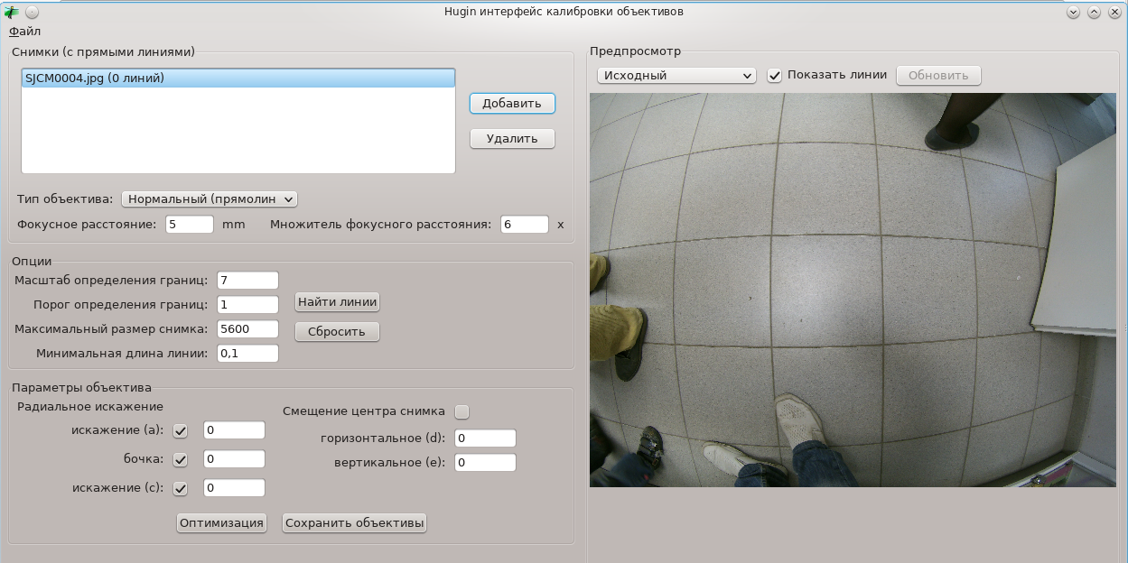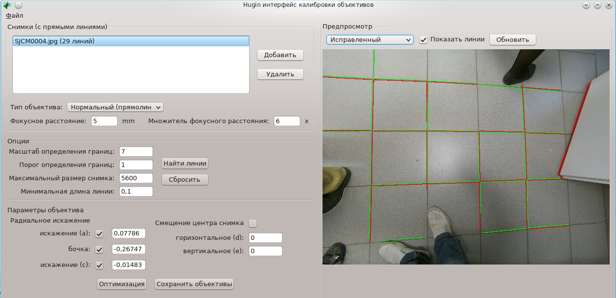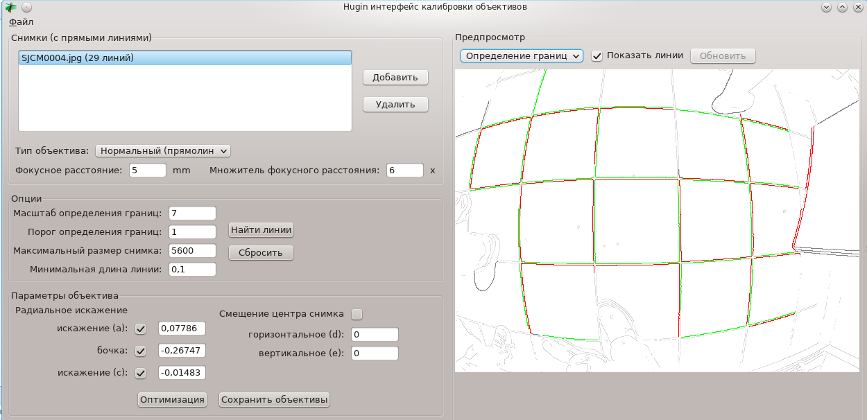 Вкладка "Искажения объектива как раз и отвечают за устранение подобных безобразий. Если редактор узнал вашу камеру, то появится ее название из EXIF (выделено красным в правом верхнем углу) и будут правильно заполнены коэффициенты коррекции. Если же не узнал, то можно либо погуглить эти коэффициенты, либо попробовать подобрать двигая регуляторы, либо откалибровать камеру (подробнее про калибровку). Можно также попробовать коэффициенты от похожих камер - но к сожалению библиотека lensfun тут нам не помощник.