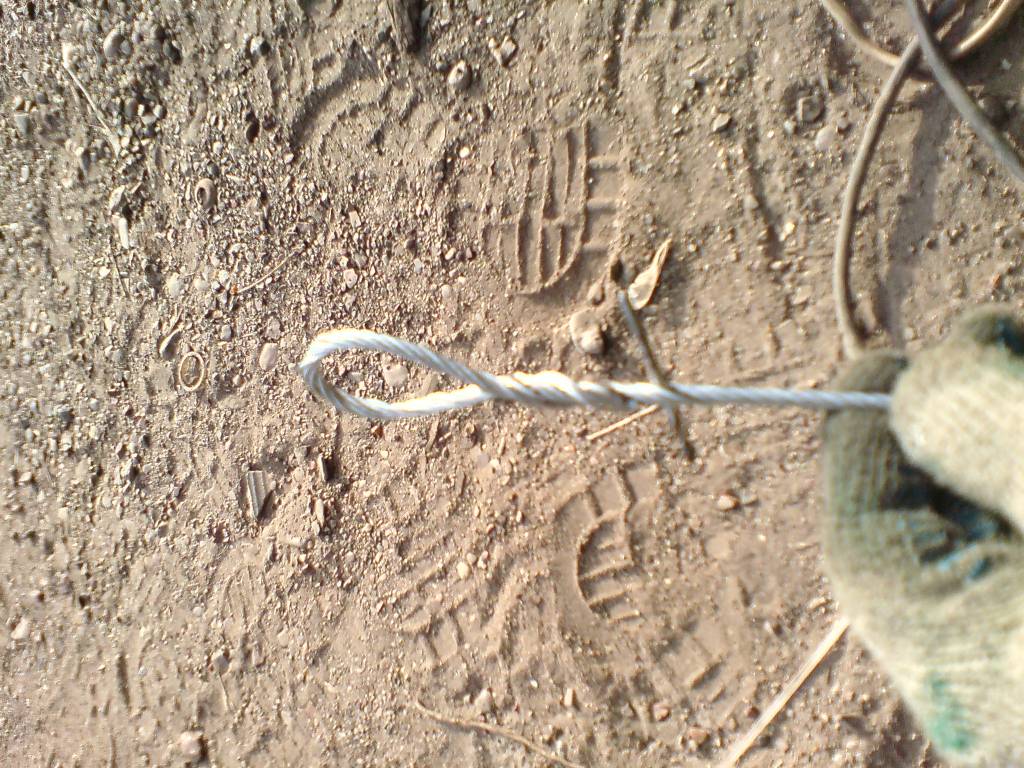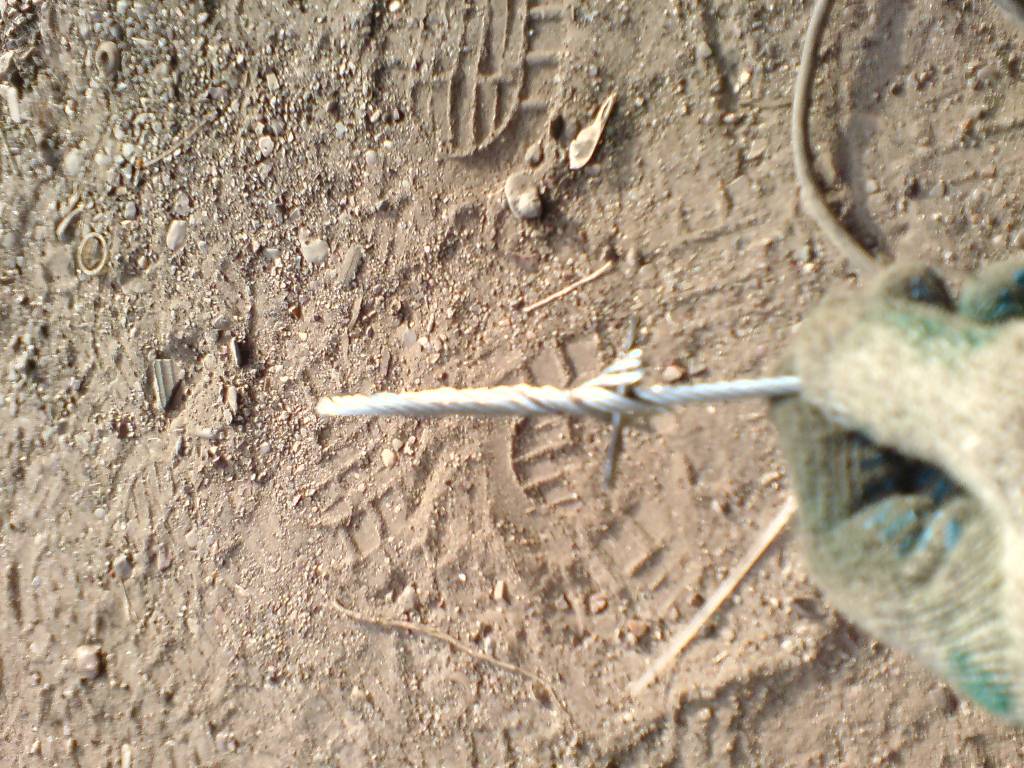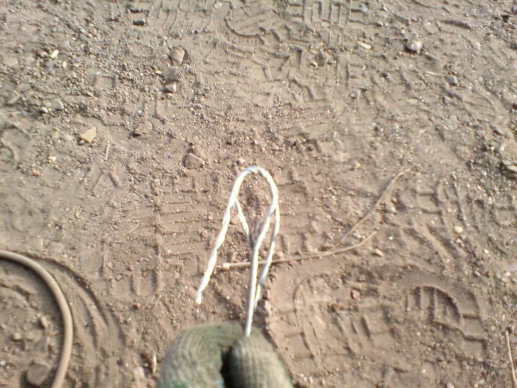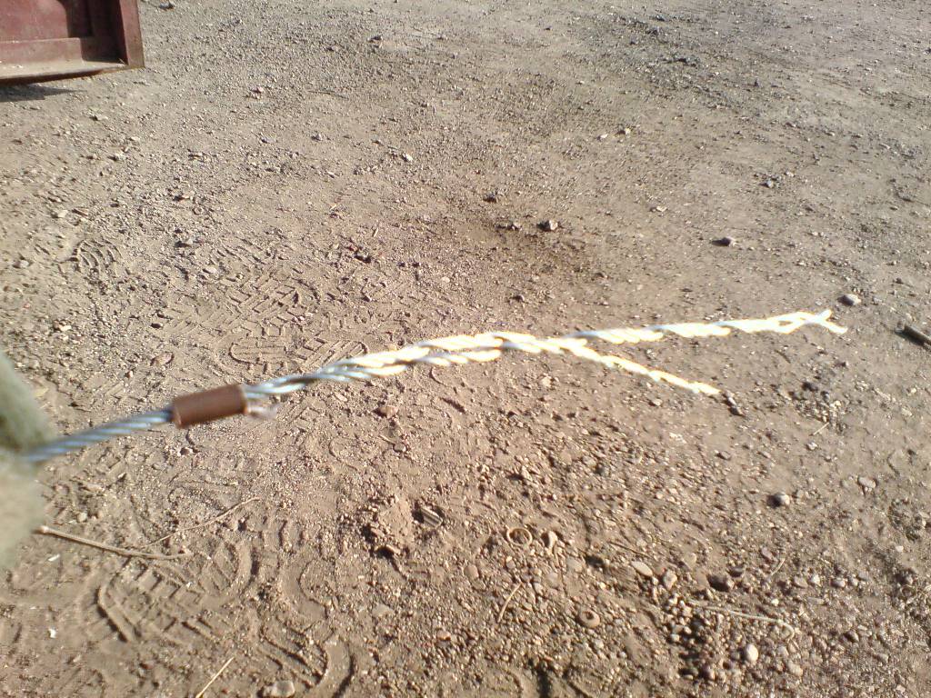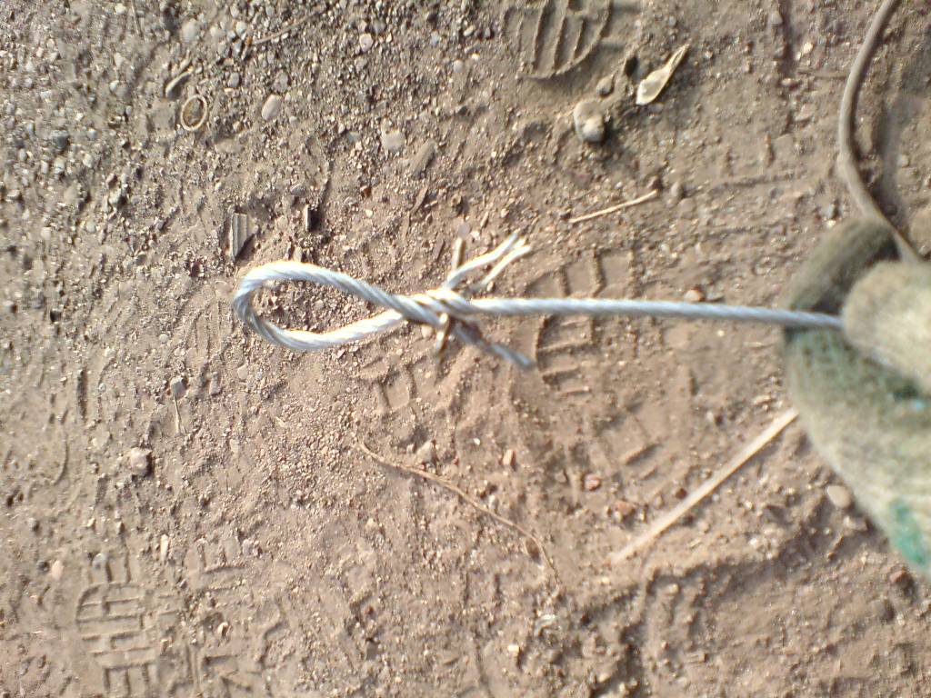 Теперь зацепляем петельку троса за какую-нибудь железку, например за засевшую машину :), и находим в инструменте подходящий стержень диаметром примерно в половину троса - для тонкого можно использовать сверло, для потолще - колышек от палатки, для совсем толстого - бородок с надетым на него трубчатым ключом. Подводим эту железку к переходу ушка в трос, и с усилием закручиваем.